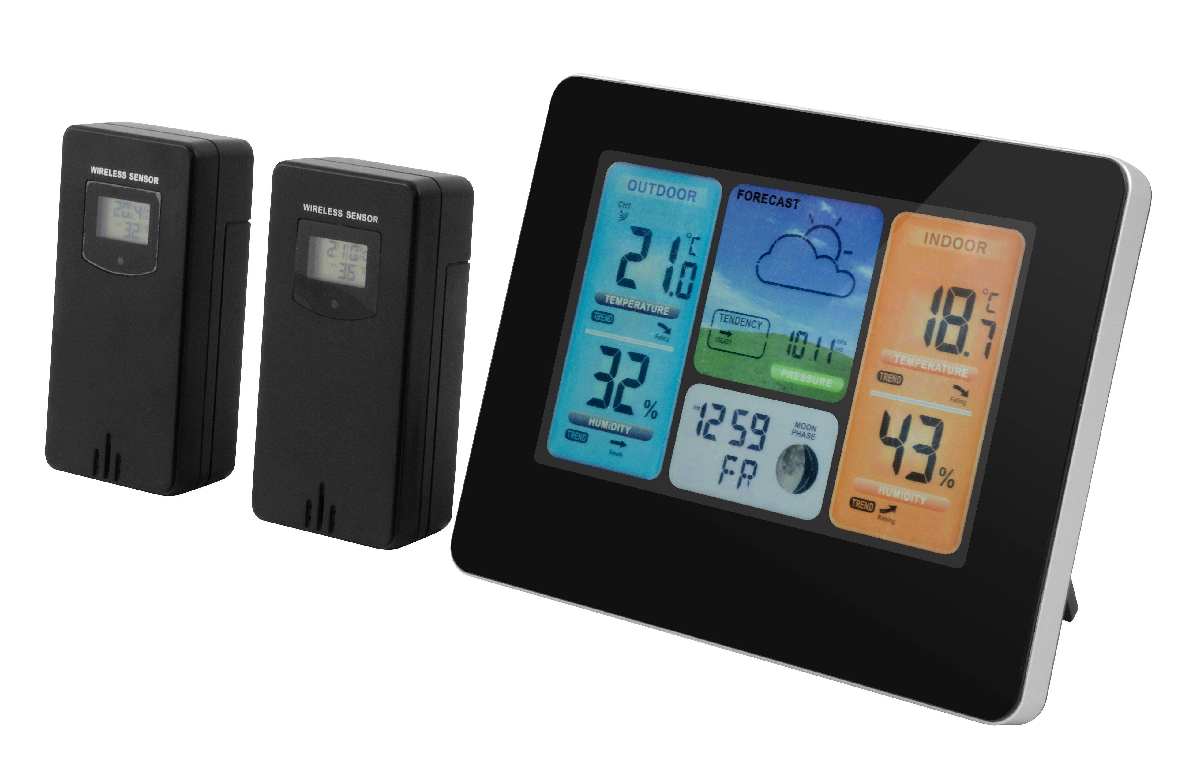 Restez à jour avec notre station météo sans fil! Cette station est équipée d'un service d'étalonnage automatique de l'heure du réseau, qui garantit des informations météorologiques précises et à jour. Il a un clip à l'arrière et un trou pour se tenir debout ou s'accrocher, ce qui le rend facile à afficher. La station peut mesurer des températures intérieures de -20 à 60 degrés Celsius et des températures extérieures de -40 à 70 degrés Celsius. Il peut également mesurer l'humidité intérieure de 20 à 95 % et extérieure de 20 à 95 %. Les prévisions météorologiques sont basées sur la pression barométrique et vous pouvez choisir d'afficher la température en degrés Celsius ou Fahrenheit. La station météo nécessite 2 piles AA (non incluses) et le capteur sans fil nécessite 4 piles AA (non incluses). Ne laissez pas la météo vous surprendre. Obtenez notre station météo sans fil aujourd'hui et soyez prêt !