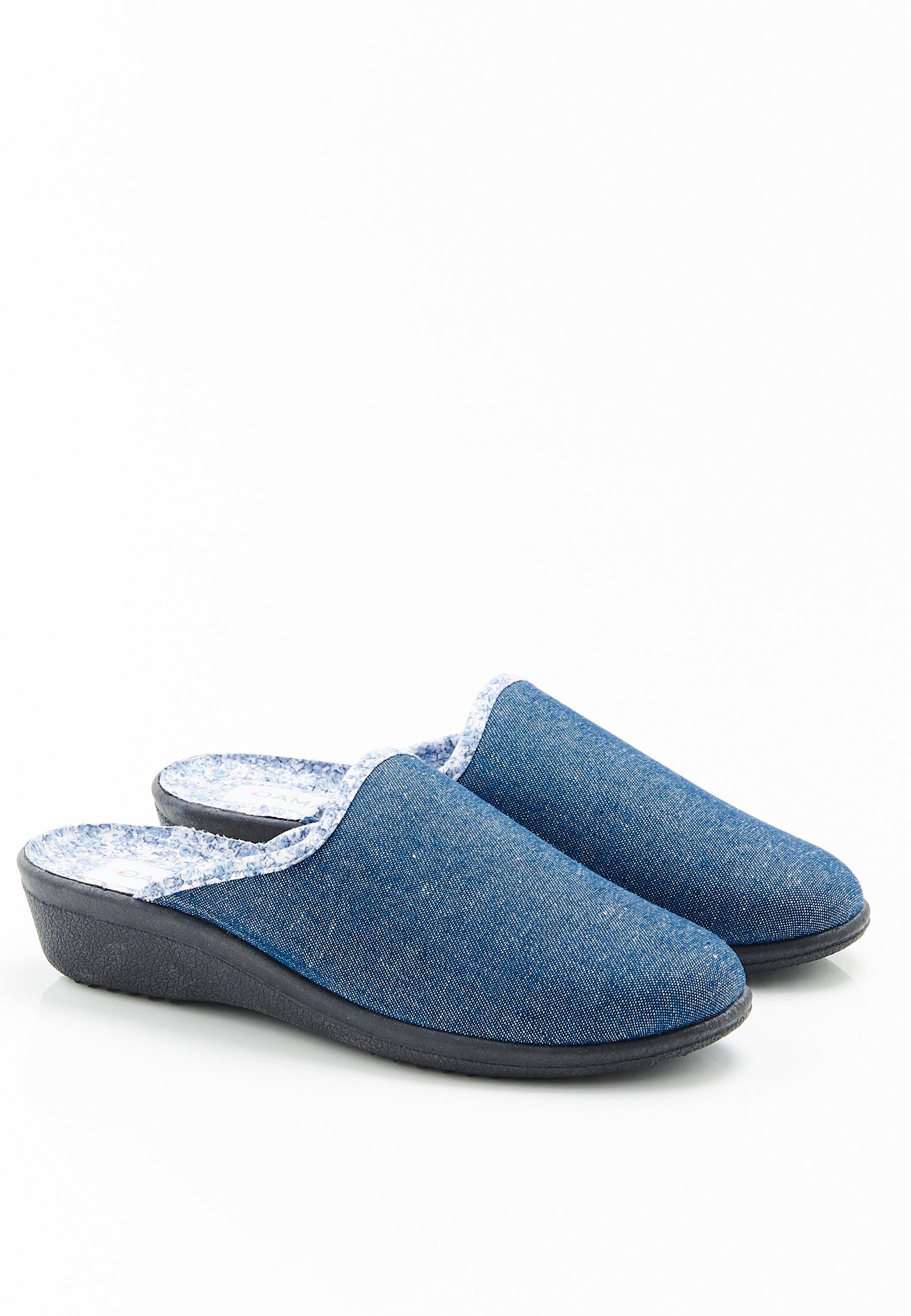 À enfiler. Confort d'un talon renforcé par un coussinet intégré. Finition biais imprimé. Dessus et doublure textile uni, semelle intérieure textile imprimé. Semelle extérieure élastomère. Talon compensé 4 cm env.