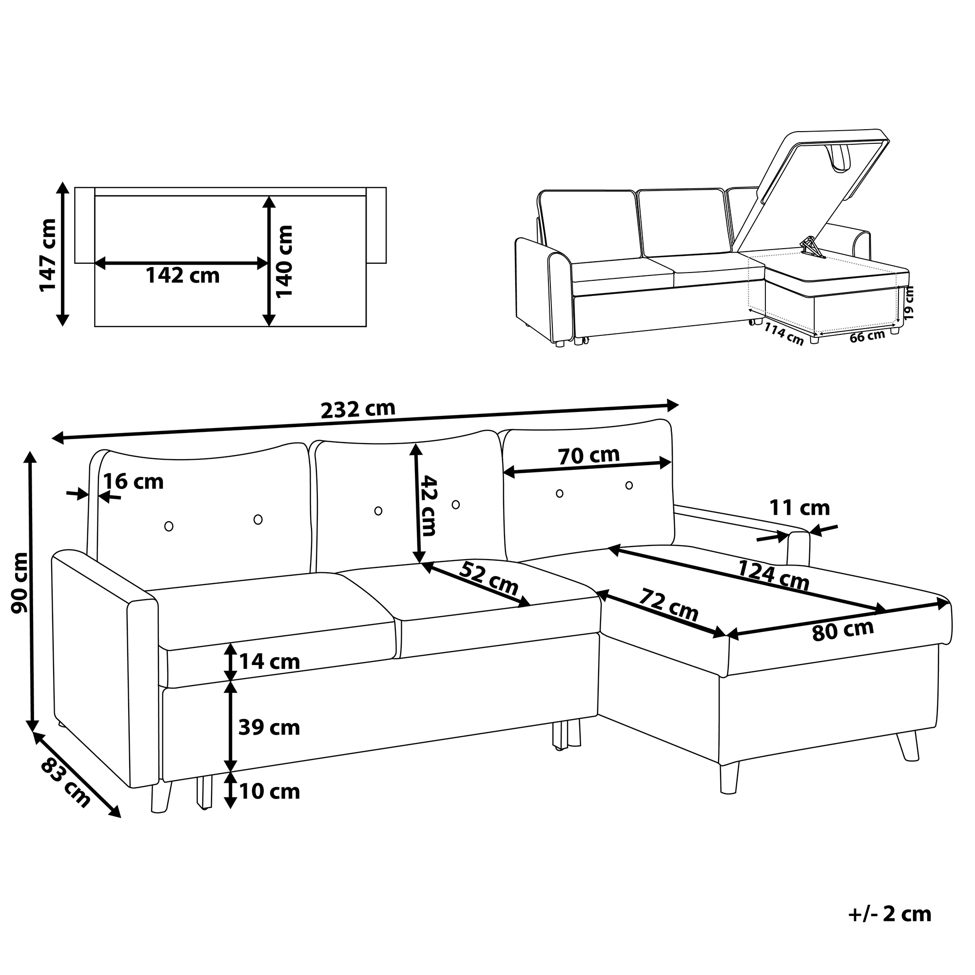 Loffre inclue:</b> 1 x Canapé d'angle<br> <br><b>Caractéristiques clés:</b> Facilement convertible en un canapé-lit, Surface de sommeil épaisse assure le confort optimal, Extrêmement confortable et agréable, Design moderne, Rembourrage de qualité supérieure, Espace de stockage supplémentaire<br> <br><b>Informations dassemblage: À assembler entièrement. 45 - 60 min