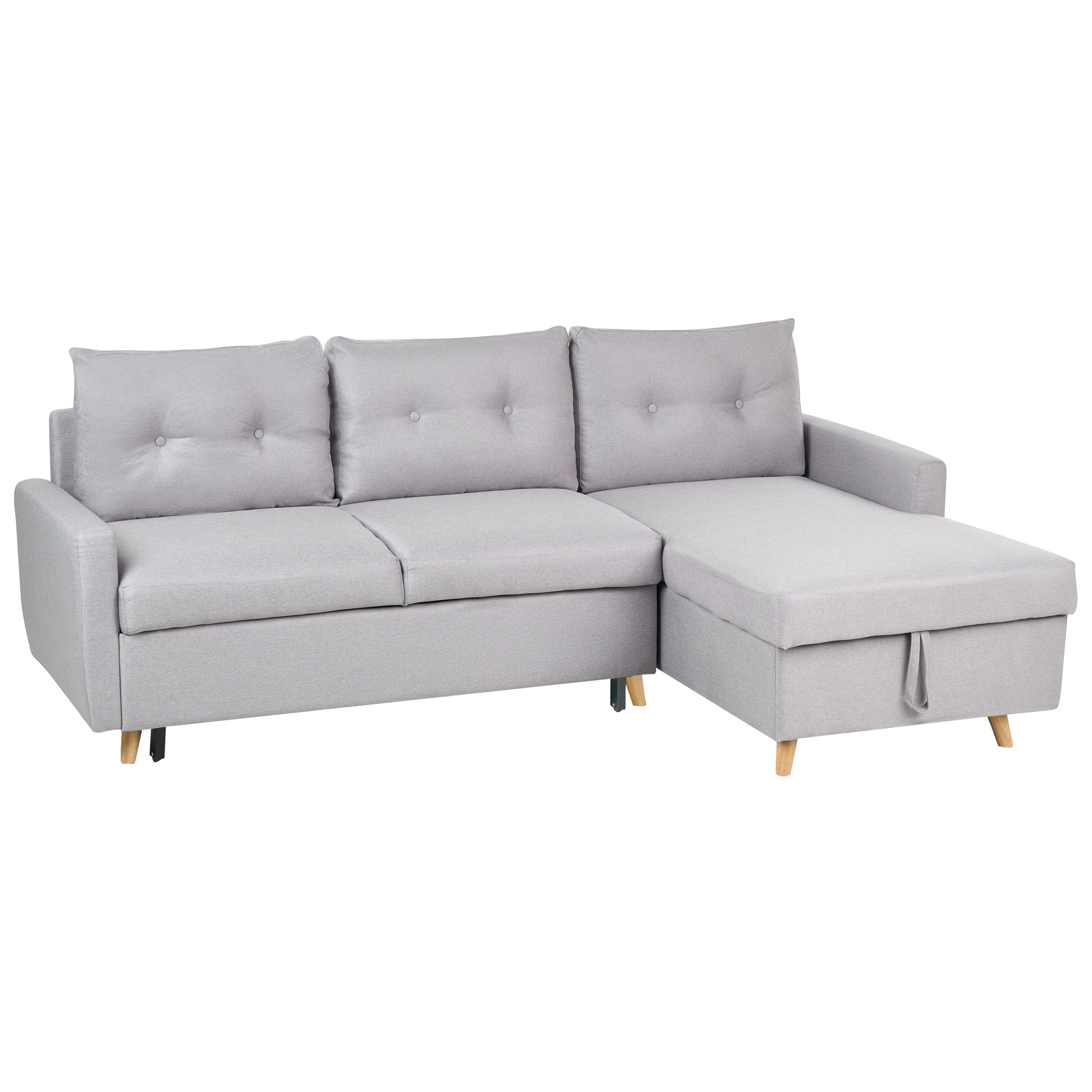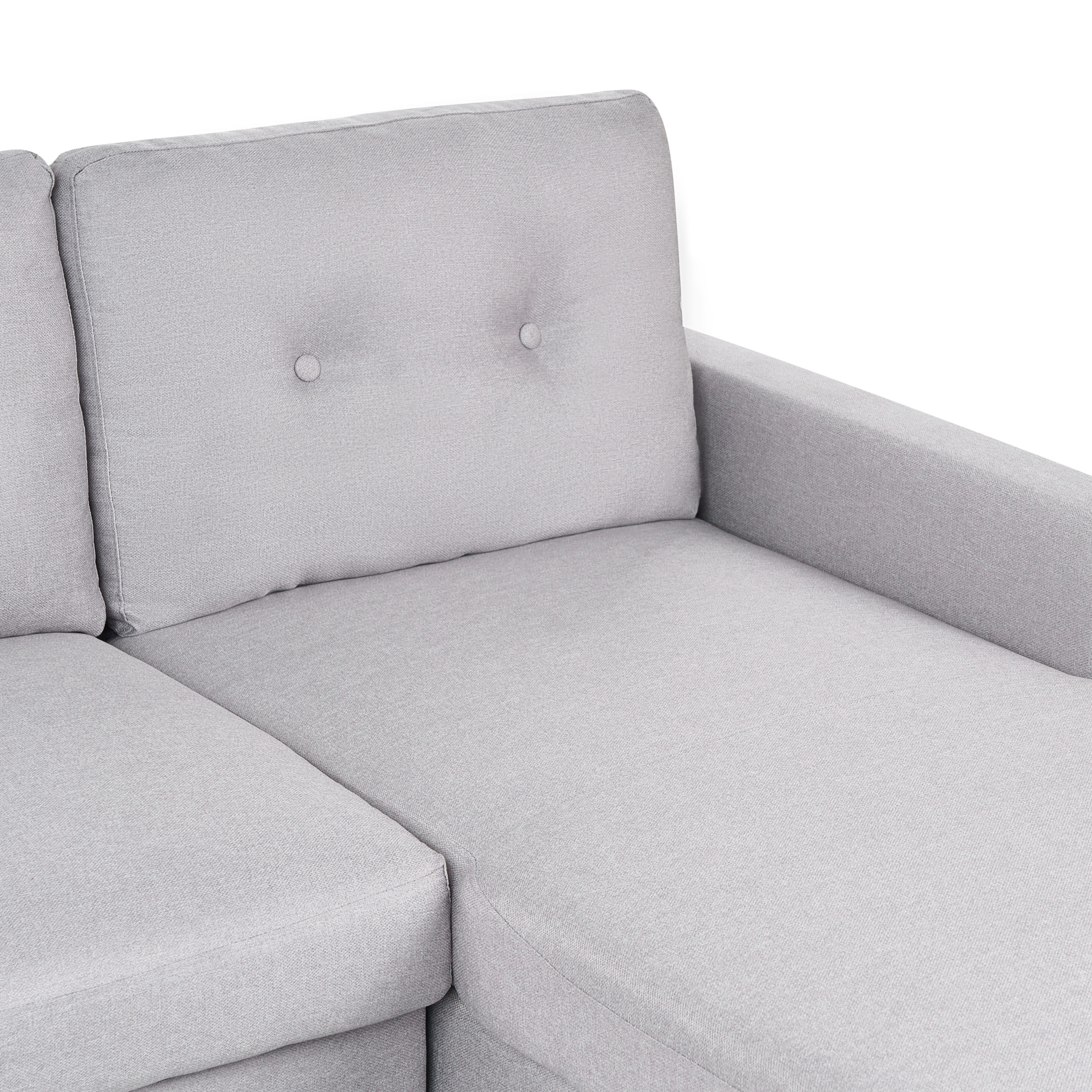 Canapé d'angle convertible au design moderne avec coffre de rangement. Créez un coin confortable pour vous reposer après une longue journée de travail, accueillez votre famille ou regardez simplement votre émission préférée avec vos amis sur ce canapé d'angle au look unique. Le revêtement en polyester tendance est extrêmement robuste, tandis que les pieds en bois d'inspiration scandinave apportent non seulement un soutien à la construction, mais lui confèrent également un aspect léger. Grâce au mécanisme coulissant, vous pouvez transformer ce canapé en lit confortable pour vos invités en une minute. L'espace de stockage intégré offre suffisamment de place pour conserver une paire supplémentaire de draps et de couettes.