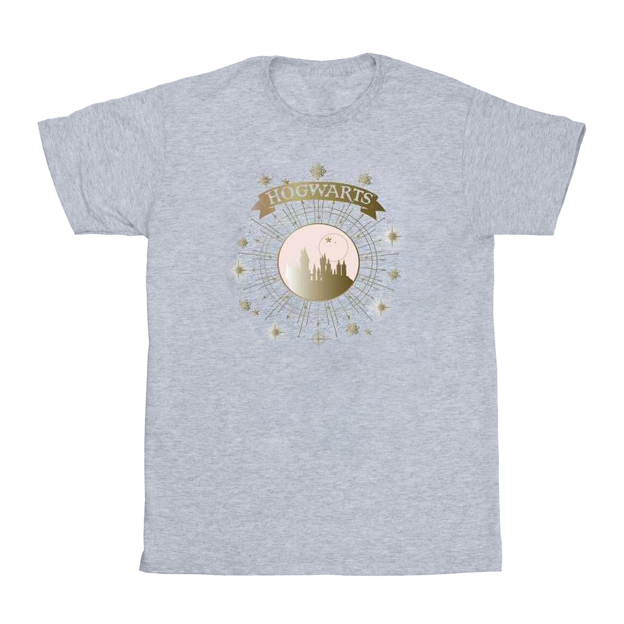 Ce T-shirt à manches courtes présente un col rond classique et une coupe confortable. Le devant est orné d'un imprimé graphique mettant en valeur la silhouette emblématique du château de Poudlard dans un design circulaire, entouré d'étoiles et d'une bannière avec l'inscription 'Hogwarts'.