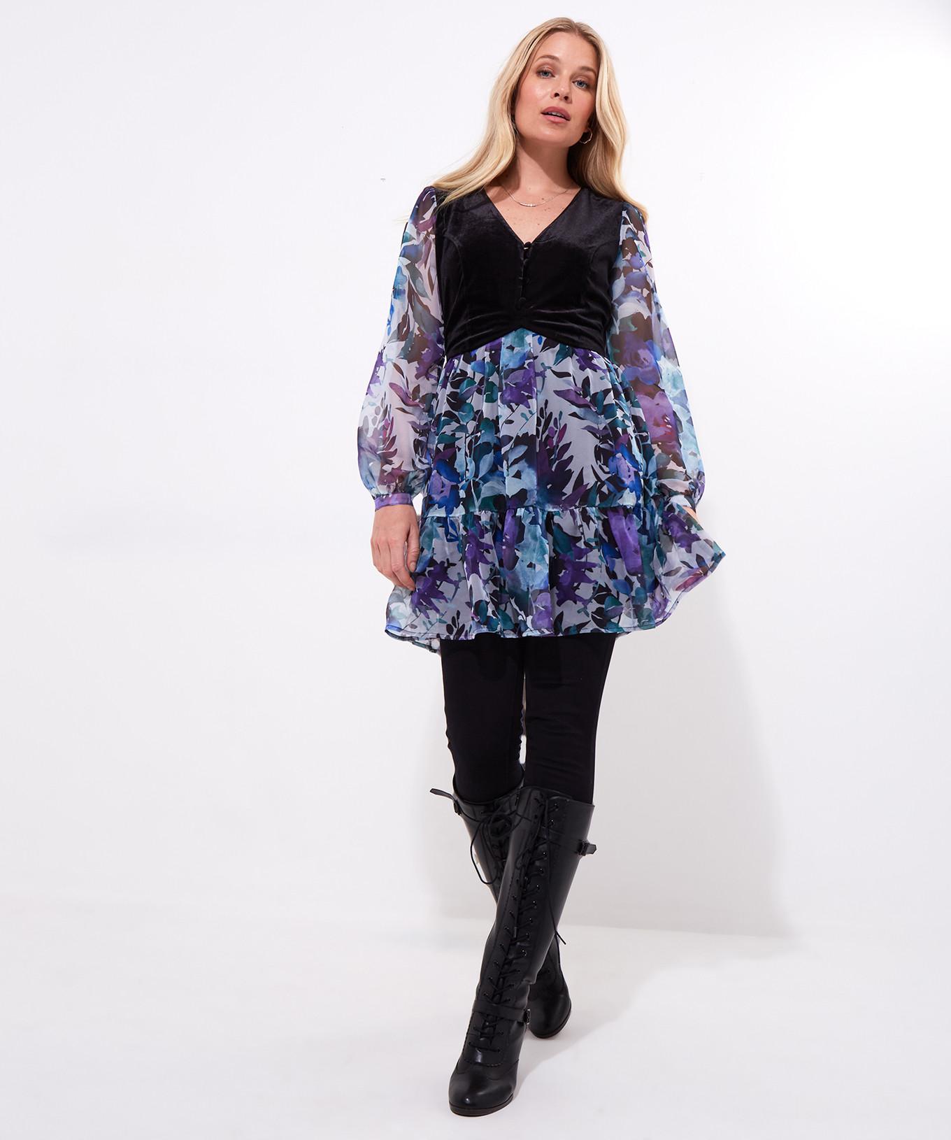 Cette robe tunique bohème présente une jupe à volants et un motif floral éclatant, offrant une option élégante et confortable pour diverses occasions. Le design comprend un décolleté en V et des manches longues, ce qui en fait un ajout polyvalent à toute garde-robe.