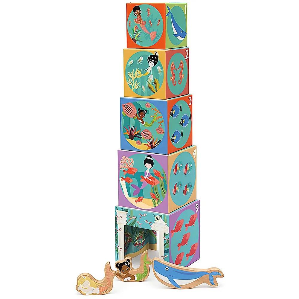 Der bunt illustrierte Stapelturm enthält fünf Würfel in unterschiedlichen Grössen und drei niedliche Holzfiguren (2 Meerjungfrauen und 1 Wal). Der Turm besteht aus robustem, haltbarem Karton. Die Figuren sind aus hochwertigem Holz gefertigt. Gestalten Sie den Turm nach Ihren Wünschen, bauen Sie ihn neu oder kreieren Sie eine Unterkunft für Ihre kleinen Unterwasserfreunde.