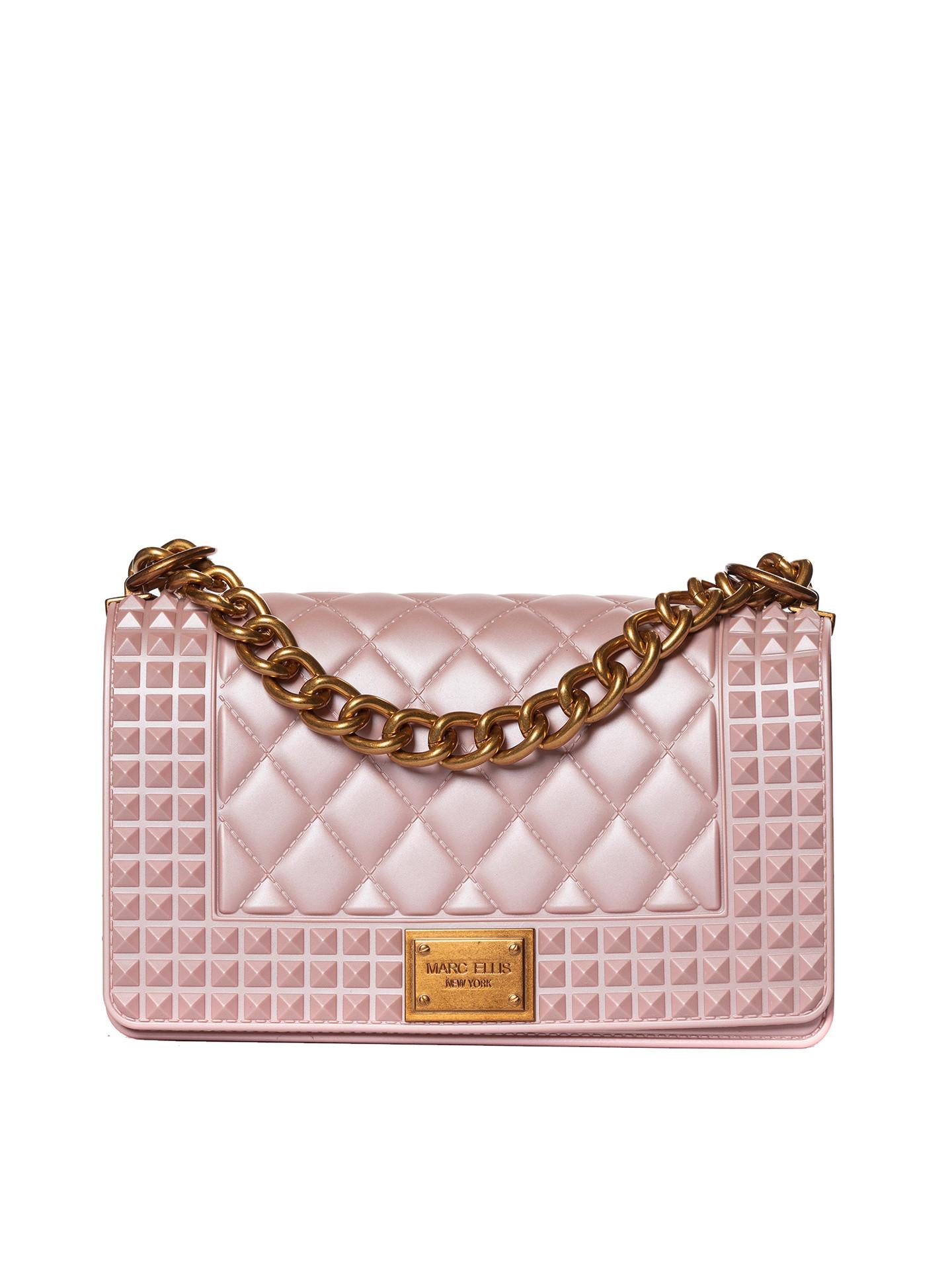 Ce sac bandoulière présente un design matelassé à l'avant et à l'arrière, complété par des détails cloutés sur les côtés et les bords du rabat. Une bandoulière en chaîne métallique proéminente ajoute une touche de sophistication audacieuse, tandis que le rabat avant est sécurisé par une fermeture à tourniquet. L'intérieur est conçu avec plusieurs compartiments pour un rangement organisé.