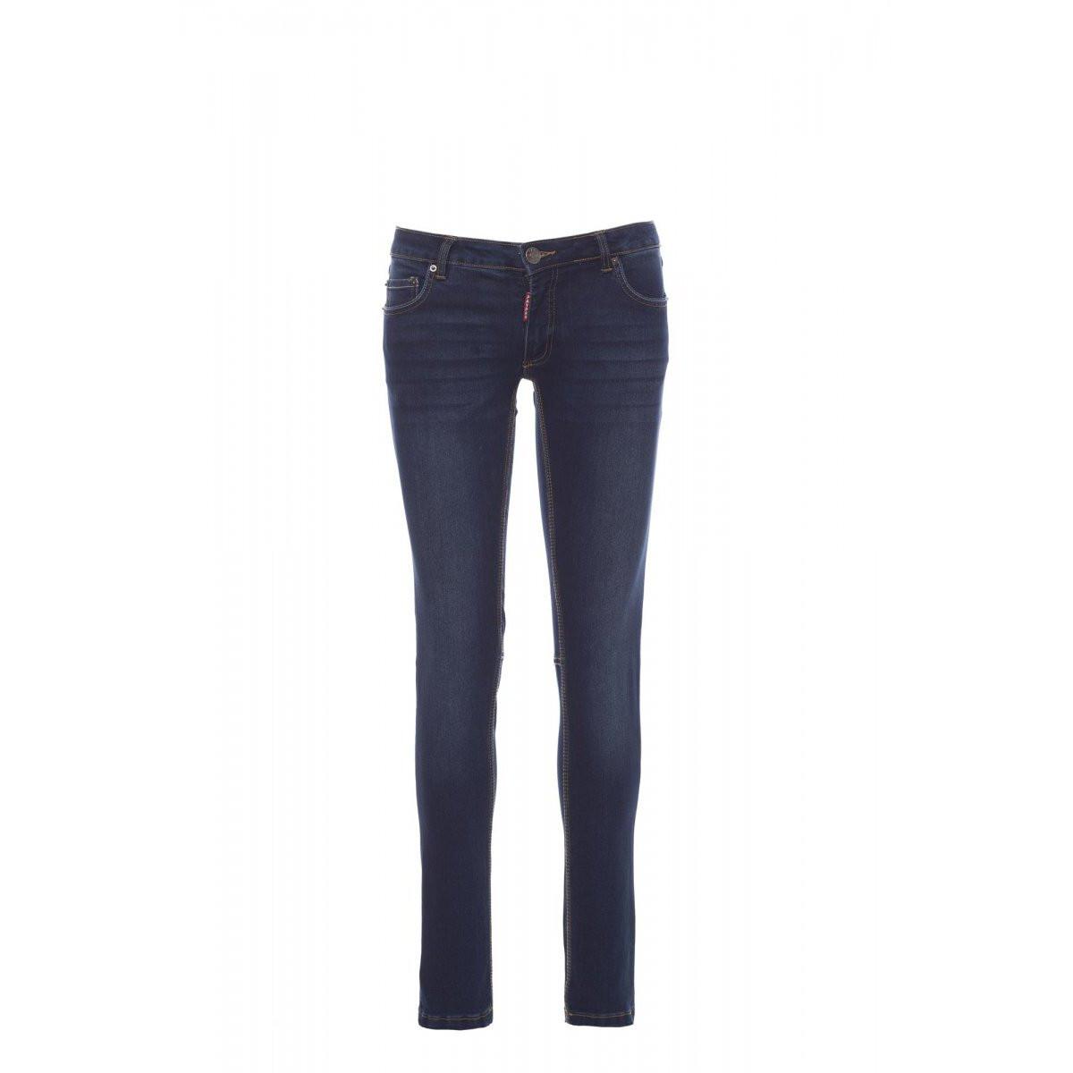 Ce pantalon femme coupe jeans est doté de cinq poches, d'un zip en métal et d'un bouton de fermeture. Il présente des passants à la taille, un porte-mètre invisible et une petite poche pour stylo et cutter. La finition « lavage à la pierre » confère un effet usé et délavé. Le pantalon a une jambe tube, avec des coutures en gros fil contrasté et une triple aiguille sur l'intérieur des jambes.