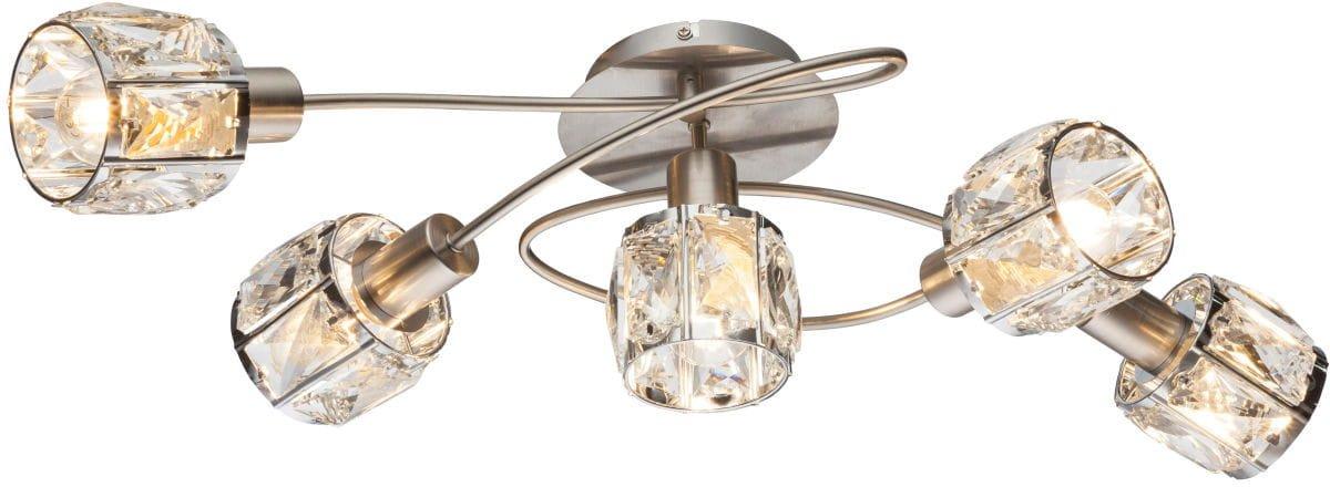 Ce spot de plafond allie matière et design. Cinq projecteurs élégants et immobiles faits de fins cristaux de verre et encadrés de métal chromé sont fixés à des bras en nickel mat magnifiquement incurvés. Les douilles E14 disponibles vous permettent de déterminer vous-même la source lumineuse et donc l'intensité lumineuse et la couleur de la lumière (max. 40W). Nous recommandons les lampes LED en raison de leurs économies d'énergie et de leur longévité. D'autres modèles de la même série de projecteurs pourraient compléter le tableau dans votre espace de vie.