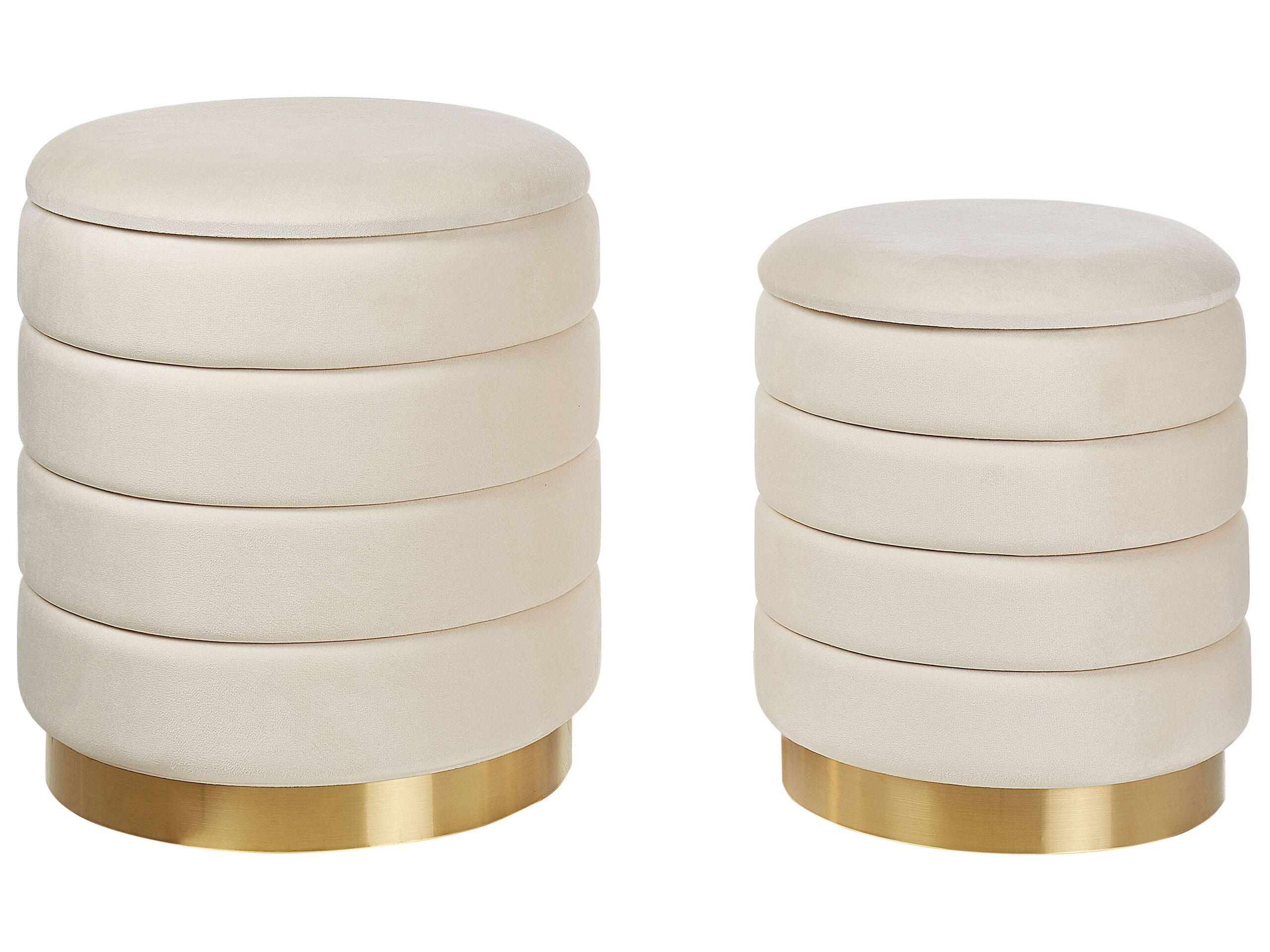 Poufs modernes avec compartiment de rangement. Transformez votre salon en un espace glamour avec cet ensemble de poufs de rangement. Leur revêtement en velours est agréable au toucher, tandis que leur élégante couleur beige clair s'accorde avec de nombreux accessoires et attire l'attention sur les tabourets. Les deux poufs sont équipés de compartiments de rangement qui permettent de dissimuler des coussins décoratifs et d'autres objets. Le design moderne est souligné par des capitons horizontaux, tandis que l'ensemble de la construction est terminé par une base dorée, ce qui fait ressortir les deux pièces.