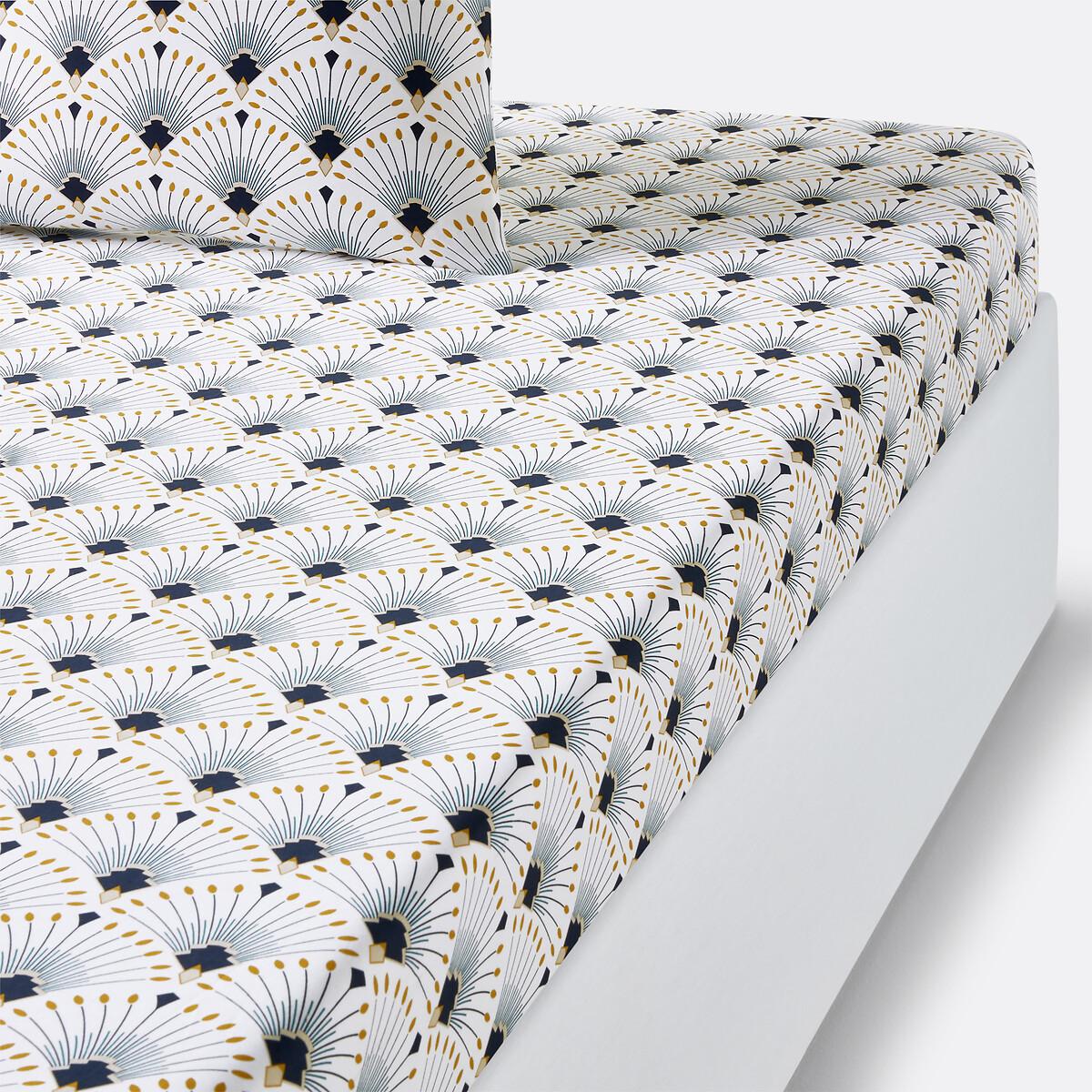 Le drap housse Pawica présente un motif imprimé élégant de style Art déco dans des couleurs harmonieuses et subtiles. Le satin, en pur coton, a un tissage particulièrement dense et une surface soyeuse et brillante.
