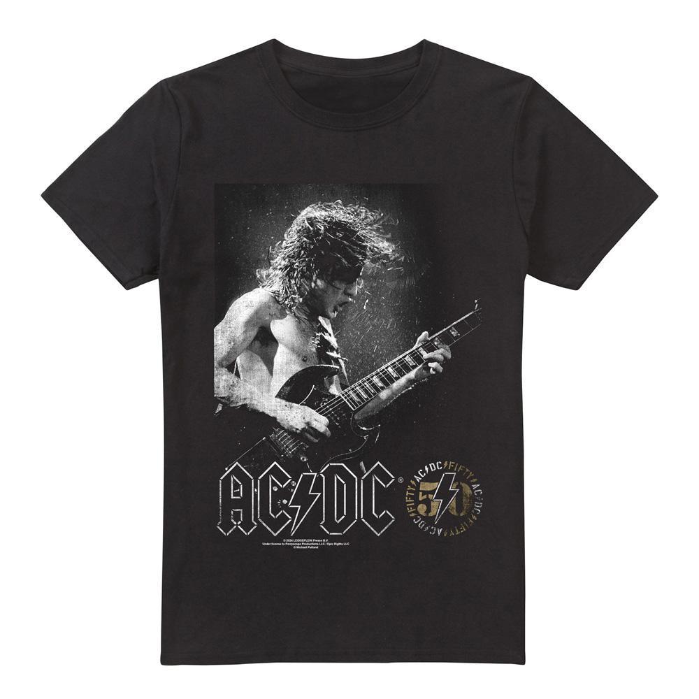 Ce T-shirt présente un col rond classique et des manches courtes, offrant une coupe confortable et polyvalente. Le devant est orné d'un imprimé graphique saisissant d'un guitariste, ainsi que du logo emblématique ACDC et d'un emblème « Fifty », célébrant l'héritage du groupe.