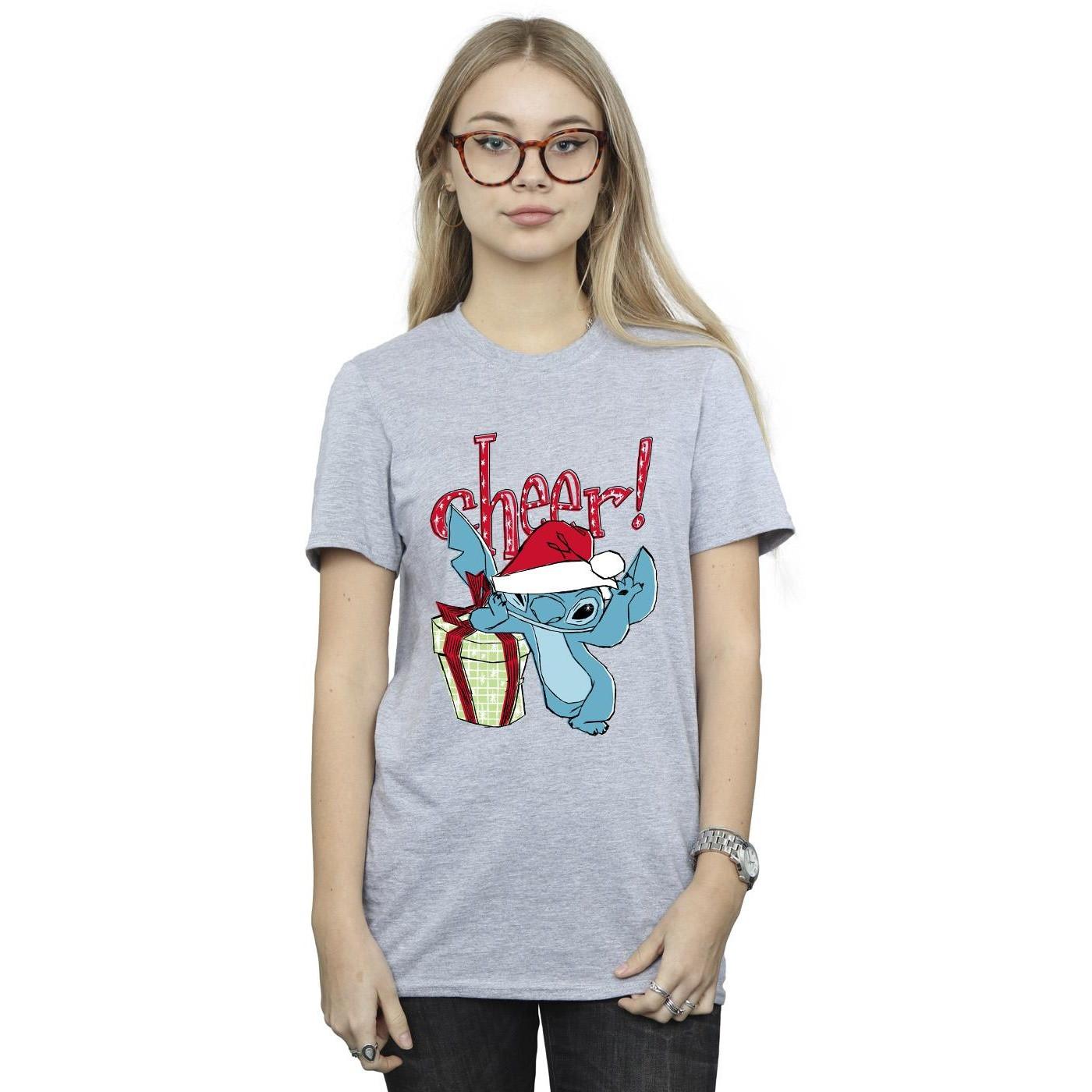 Ce t-shirt à manches courtes présente un graphique festif de Stitch de Lilo & Stitch de Disney, portant un bonnet de Père Noël et tenant un cadeau emballé. Le mot « cheer! » est affiché en évidence au-dessus du personnage, ce qui en fait un ajout amusant et joyeux à toute garde-robe.