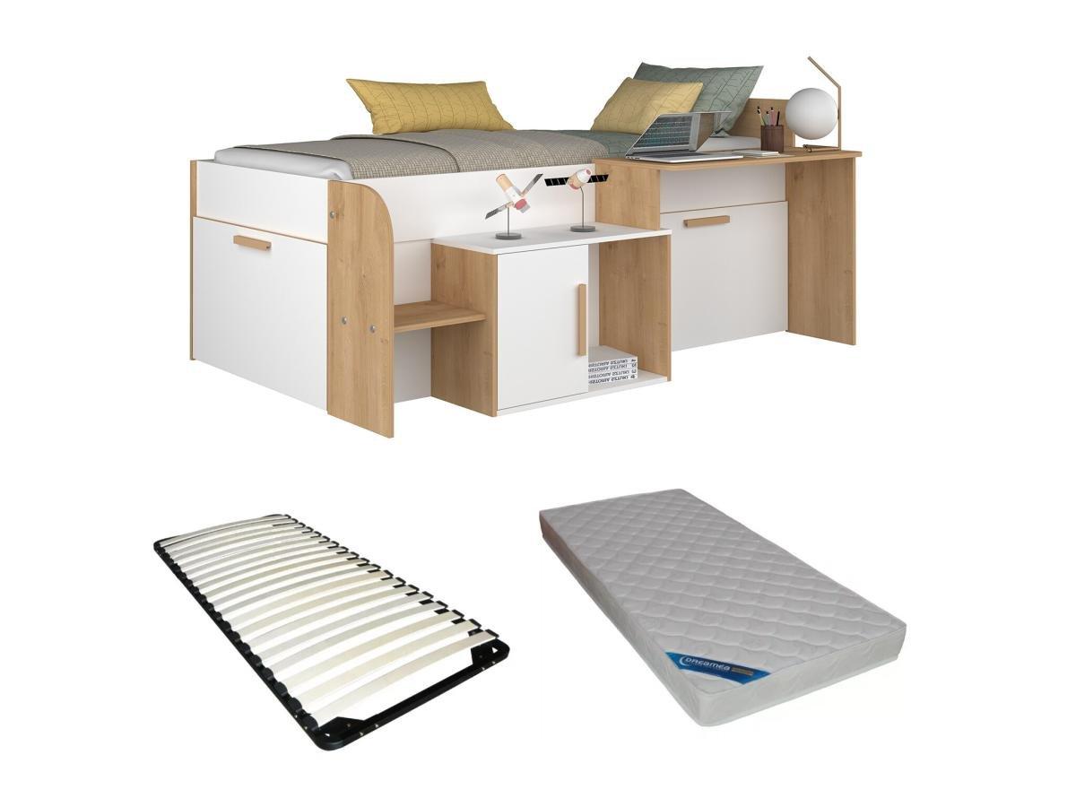 Vente-unique Lit combiné 90 x 200 cm avec bureau et rangements - Coloris : Blanc et naturel + Sommier + Matelas - PEDRO