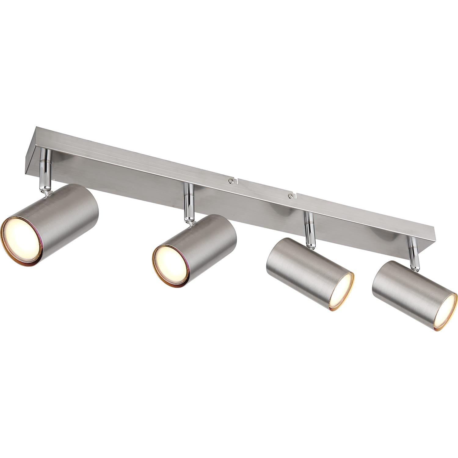 Ce projecteur simple de la série Robby impressionne par son design et sa palette de couleurs. Il y a quatre douilles GU10 sur un support de plafond rectangulaire en nickel (56x6cm), chacune recouverte d'un abat-jour cylindrique. La douille GU10 vous permet de choisir librement les ampoules, jusqu'à une puissance maximale de 35 watts.