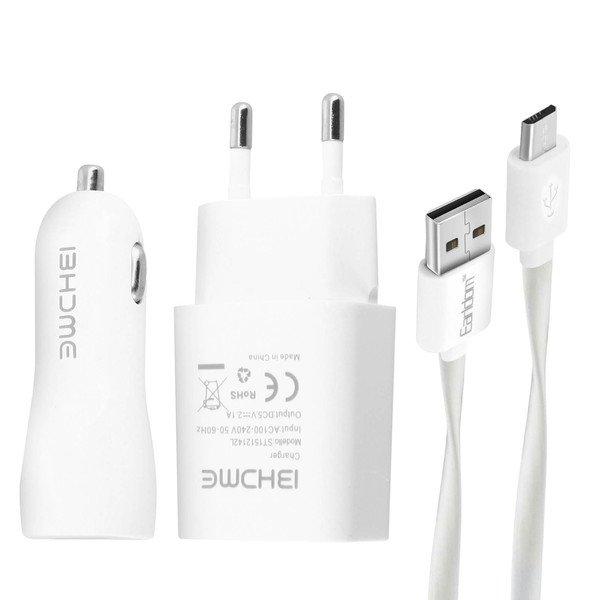 Pack de recharge 3 en 1 : chargeur secteur 2.1A, chargeur allume-cigare 2.1A et câble Micro-USB 1m. Recharge rapide et sécurisée. Déplacements en voiture optimisés. Design compact facile à emporter.