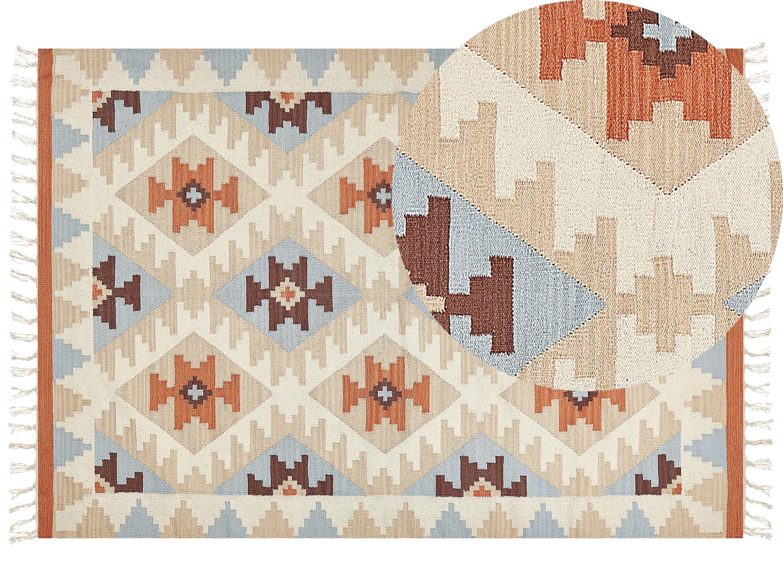 Tapis avec motif traditionnel. Mettez en valeur la décoration de votre salon ou de votre chambre avec ce magnifique tapis Kilim. Il est tissé à la main en coton, ce qui lui confère une grande résistance et une belle qualité. Le tapis est orné d'un motif géométrique éclatant, qui apporte une touche d'élégance raffinée à chaque pièce. Son design universel vous permet de changer de décoration facilement. Profitez du confort sans sacrifier la qualité, car ce tapis est lavable en machine, ce qui garantit un entretien facile.