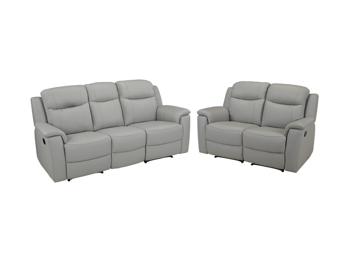 Canapé 3 places et 2 places EVASION. Cuir de vachette fleur corrigée pigmentée couleur gris Dossier en fibres de polyester siliconées (22 kg/m3) et assise en mousse polyuréthane haute résilience pour un accueil moelleux. Densité d'assise 28 kg/m³. Suspension sur ressorts ensachés et sangles élastiques. Structure pin massif et contreplaqué essence hévéa. Tour de caisse et repose pied en simili. Mécanisme relax manuel.