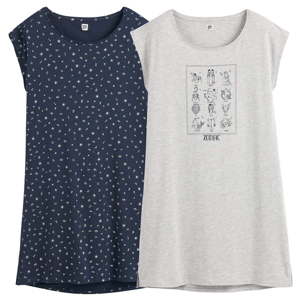 Ce lot de 2 chemises de nuit offre confort et style pour des nuits reposantes. Une chemise de nuit présente un fond bleu foncé avec un motif céleste blanc, tandis que l'autre est gris clair avec un graphique central 'Zodiac' représentant divers signes du zodiaque. Les deux chemises de nuit ont une coupe régulière et des manches courtes, ce qui les rend adaptées à un port confortable.