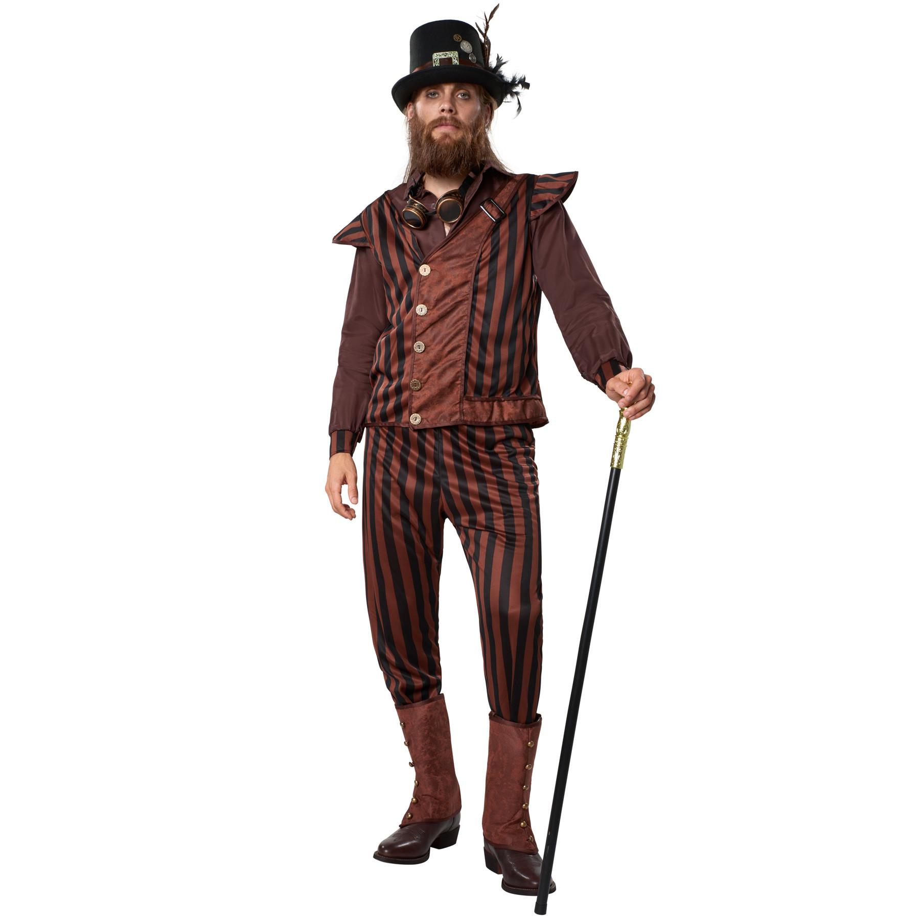 Le costume pour homme de gentleman steampunk se compose d'un long pantalon rayé en satin et de revers de botte aspect daim. La chemise à manches longues possède des boutons et un col. Les manchettes reprennent l'aspect rayé du pantalon. Le gilet sans manches à épaulettes affiche un motif rayé. Il se boutonne et présente un empiècement en daim avec des boucles. Matériau : 100 % polyester.