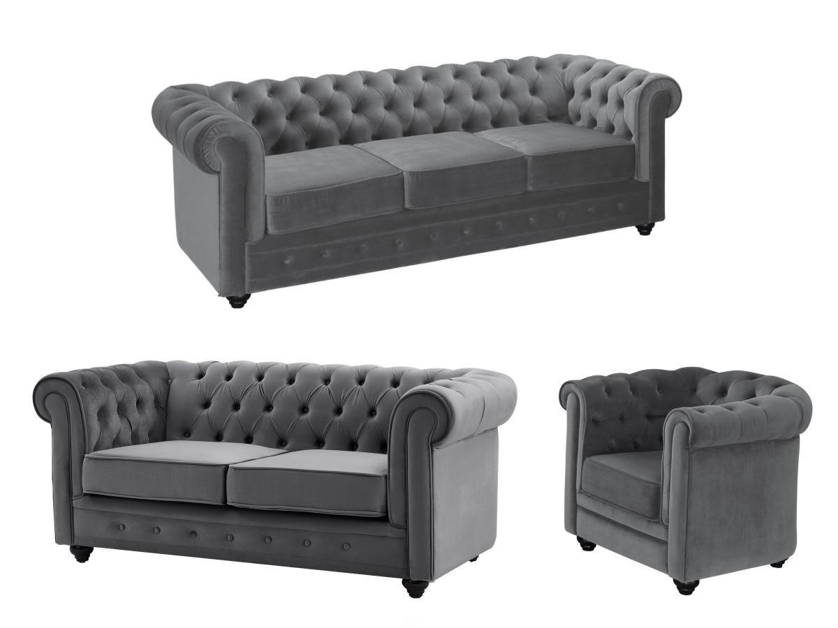 Vente-unique, Canapés 3 places et 2 places et fauteuil en velours anthracite CHESTERFIELD