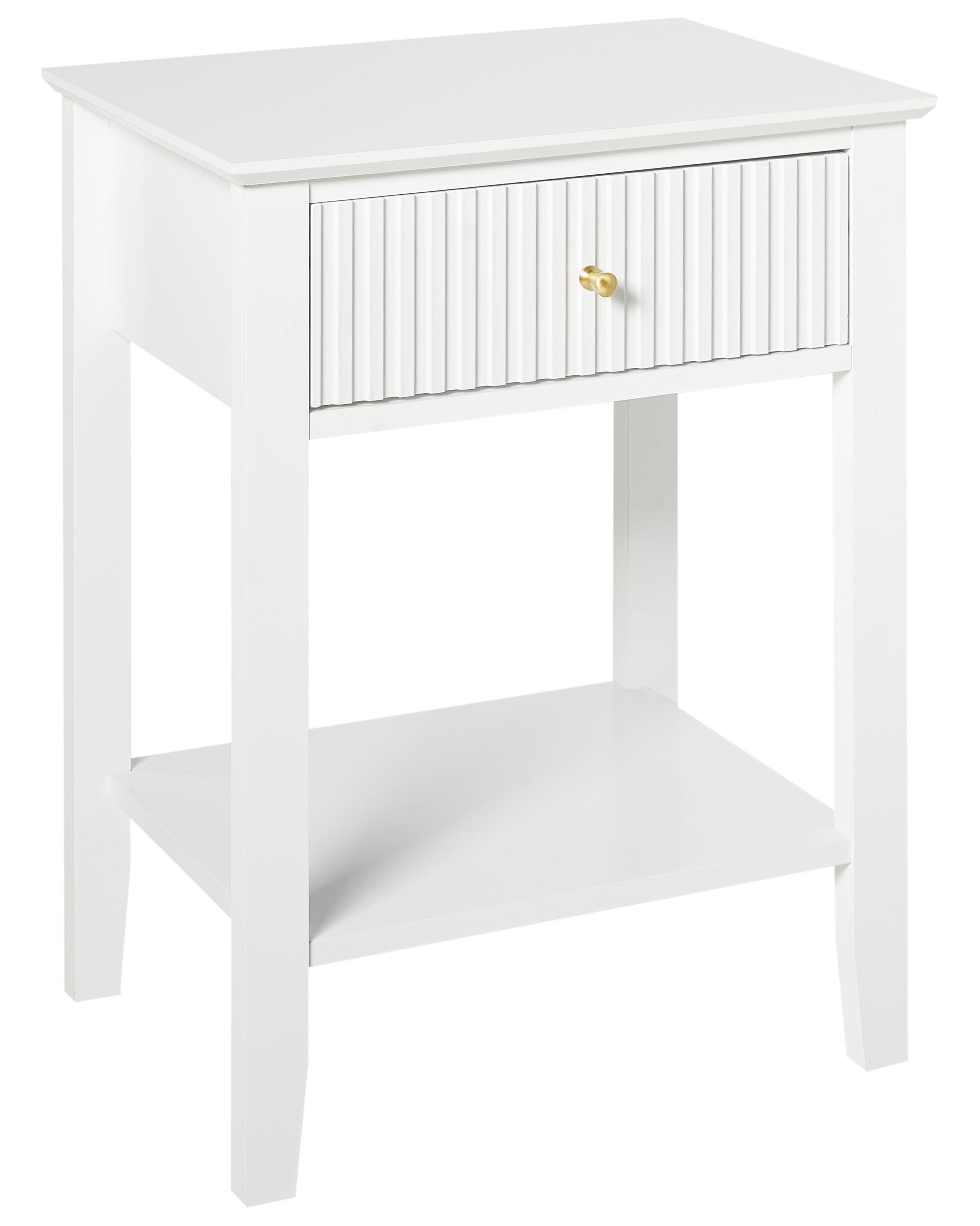 Table de nuit avec tiroir strié. Cette table de chevet élégante est un complément idéal à toute chambre à coucher. Son design simple et sa construction robuste en MDF ajoutent de l'élégance à l'espace et garantissent la stabilité. La table de chevet comporte un tiroir avec une poignée dorée sophistiquée et une étagère en bas, offrant un espace de rangement supplémentaire. La couleur neutre et polyvalente de la table de nuit lui permet de s'adapter à un large éventail de styles d'intérieur.
