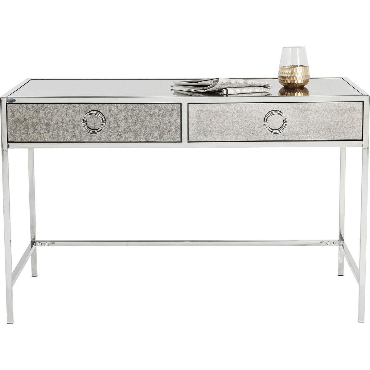 Cadre en acier inoxydable résistant et poli Surface en verre élégante et revêtue Deux tiroirs spacieux avec poignées en acier chromé Livré à l'état partiellement démonté Coloris gris argenté moderne Taille pratique idéale pour le bureau à domicile Design extravagant et luxueux