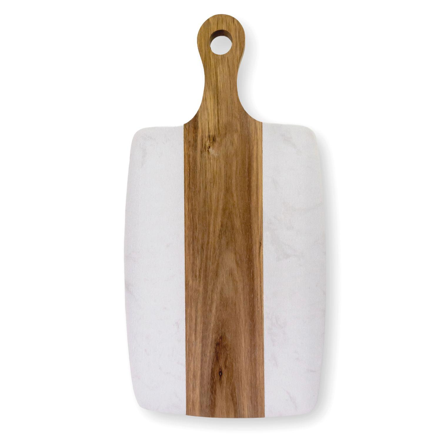 Intirilife présente un chef-d'œuvre d'esthétique culinaire avec cette planche à découper et à servir en marbre blanc et en bois. Avec ses 35 x 18 x 1,5 cm, elle combine fonctionnalité et design d'une élégance exceptionnelle. Cette planche est un véritable multitalent : elle ne sert pas seulement de support robuste pour les travaux de découpe, mais se transforme aussi en un plat de service élégant à chaque occasion.