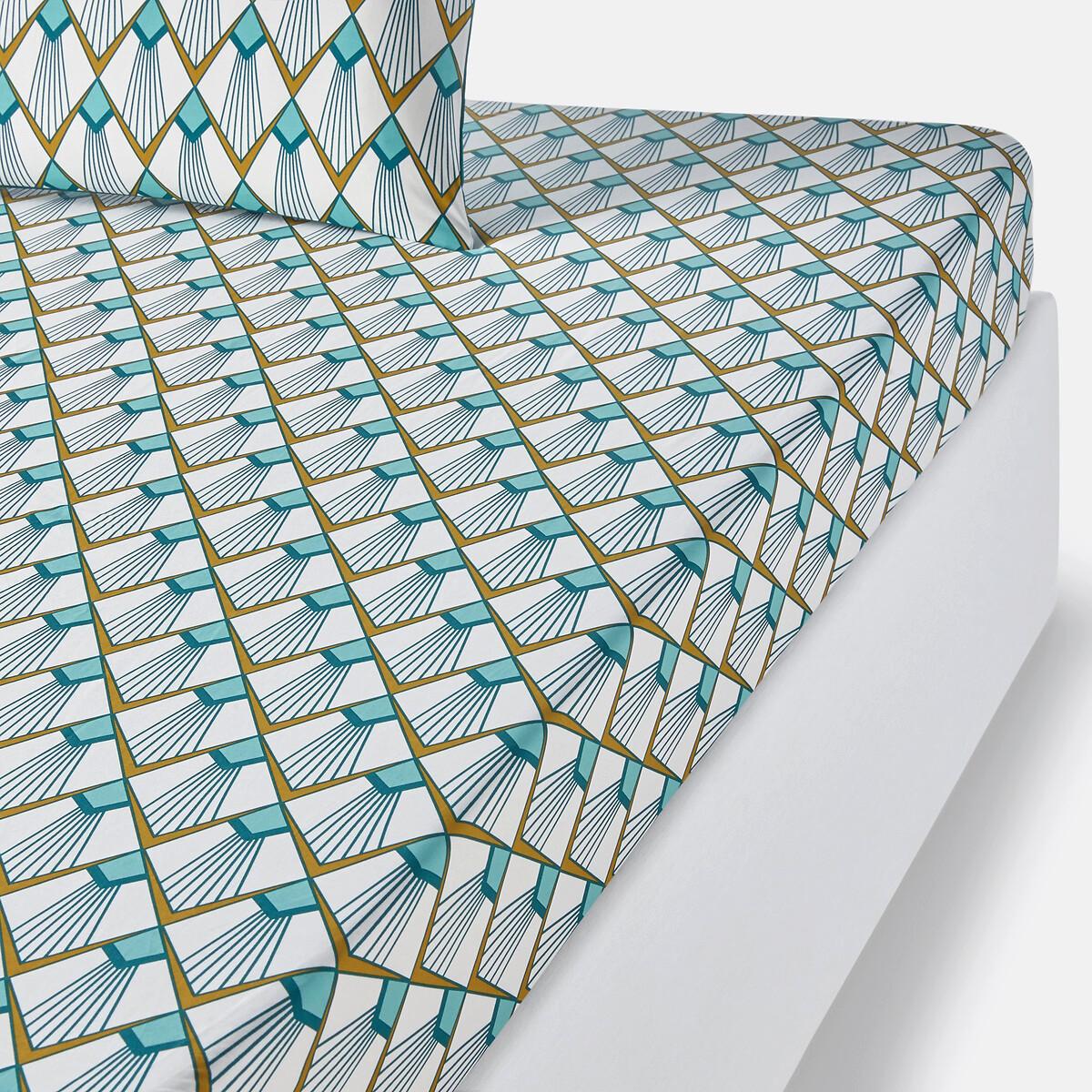 Le drap-housse imprimé Elisa est en percale. Cette parure, avec ses motifs géométriques aux tonalités douces et harmonieuses, s'inspire d'un style vintage.