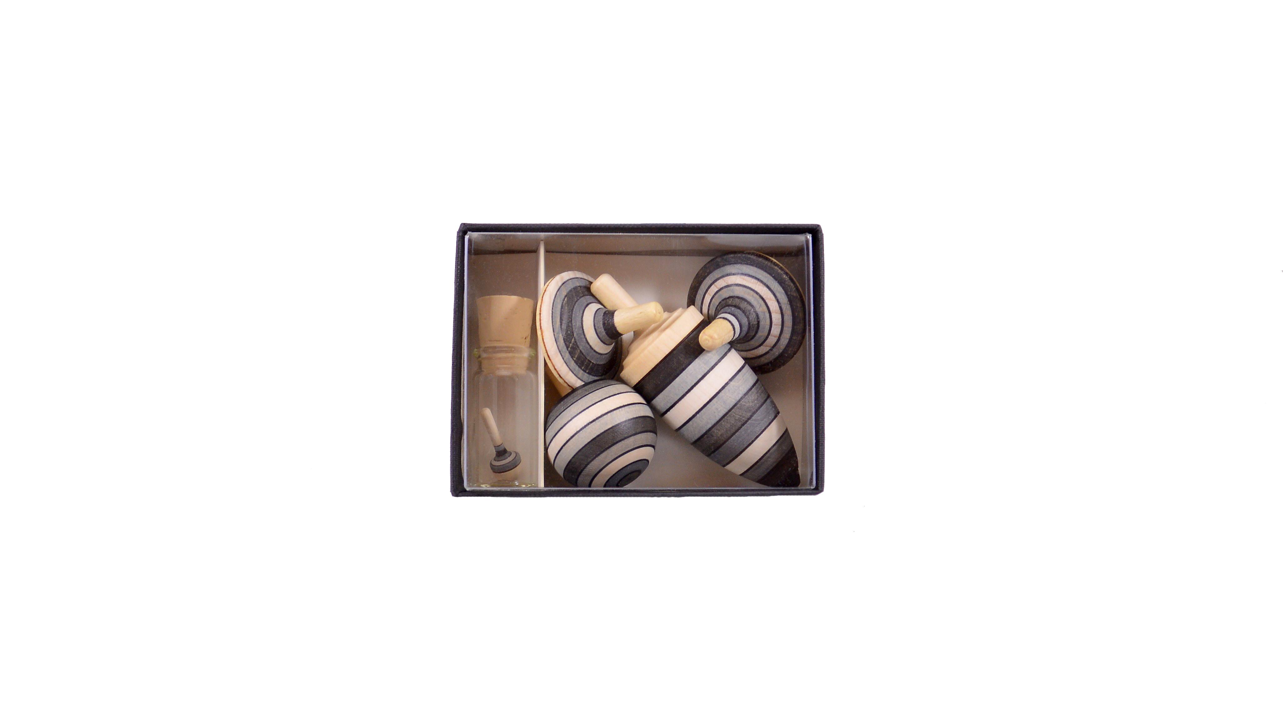 Kit d'apprentissage pour toupie avec 5 toupies de niveau très facile à très difficile, avoir du succès en jouant, avec instructions, niveau de difficulté 1 à 6, bandes en tons bleus.