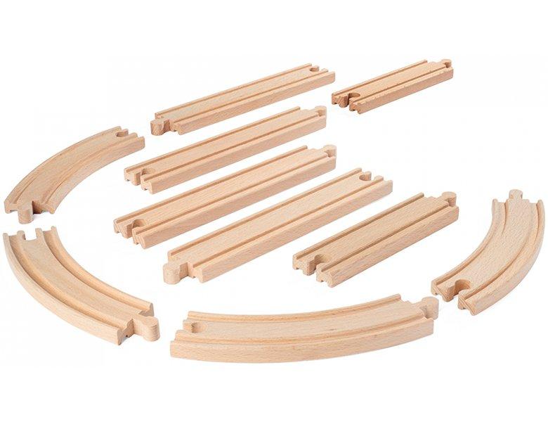 Dieses Schienenset für Schienenbahnen beinhaltet 10 Teile: 4 grosse Kurvenschienen, 4 lange gerade Schienen und 2 kurze gerade Schienen. Die Schienen sind aus FSC 100% Buchenholz gefertigt und lassen sich nahezu mit allen gängigen Schienenbahnen kombinieren. Eine ideale Erweiterung für kreatives Spielen.