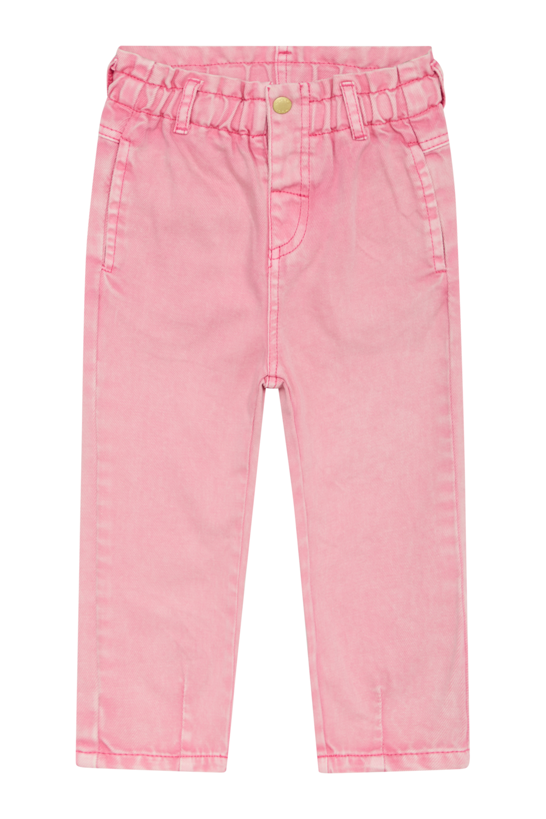 Weiche Baumwollhose mit Taschen vorne und hinten. Die Gesäßtaschen sind mit Schleifen verziert. Dieses Modell verfügt über einen Elastikbund und einen Fake Hosenlatz mit Knopfverschluss. Mit anpassbarer Taille ausgestattet.
