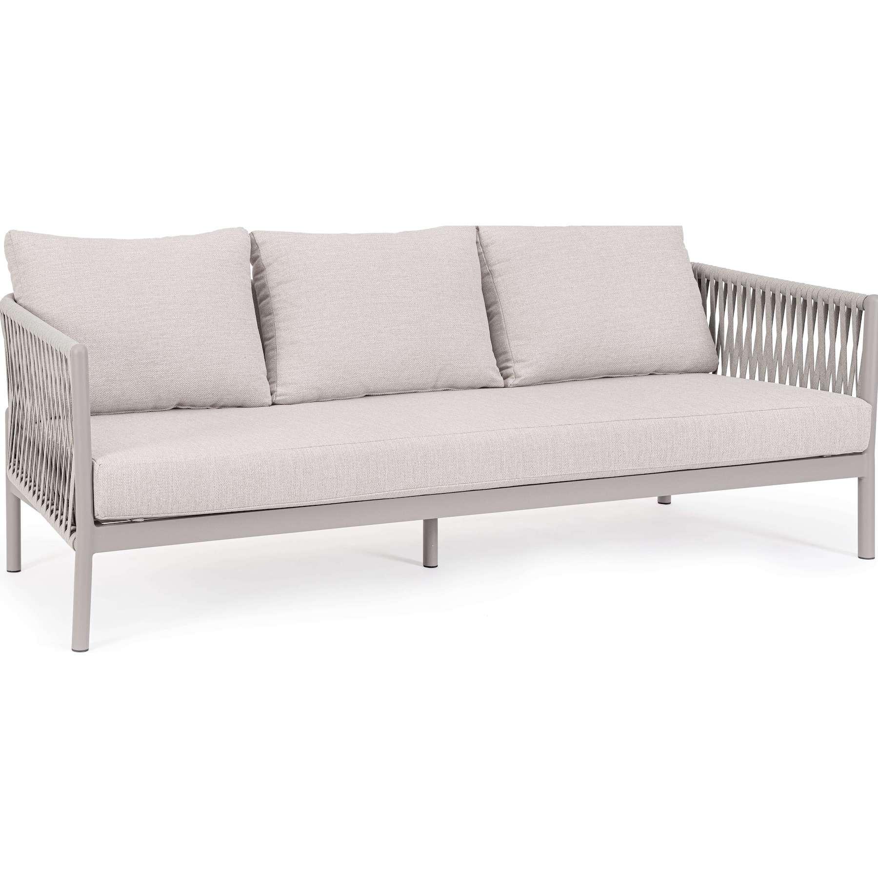 Canapé en aluminium et polypropylène, couleur gris clair, 220 x 85 x 86hStructure en aluminium avec revêtement en poudre (polyester)Tressage avec cordes en tétoron (100% polyester)Coussins déhoussables de l'assise et du dossier en tissu oléfine (100% polypropylène)
