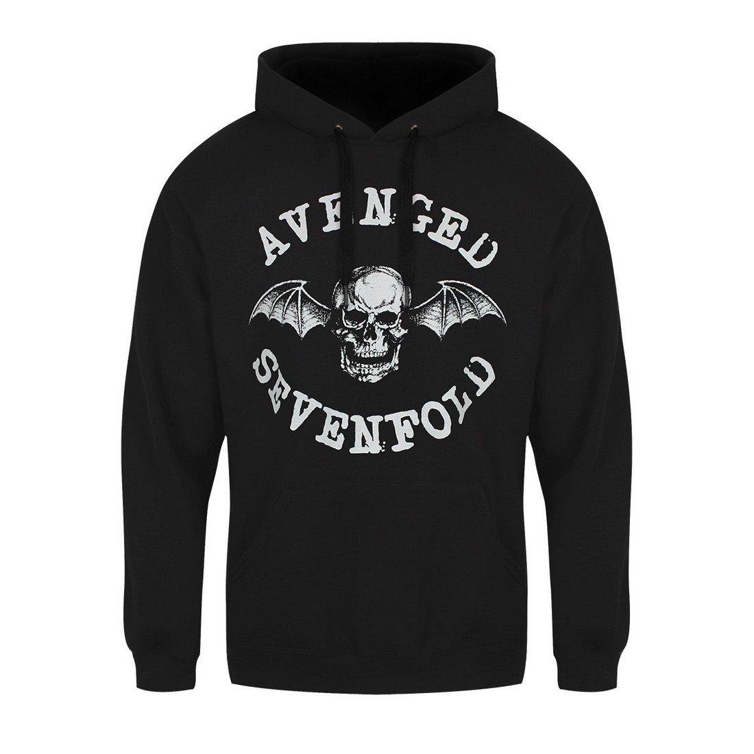 Ce sweat à capuche présente un imprimé graphique saisissant d'un crâne avec des ailes de chauve-souris, encerclé par le nom du groupe "Avenged Sevenfold". Le design est mis en évidence sur le devant, ce qui en fait une pièce audacieuse pour les fans. Le sweat à capuche comprend une capuche confortable avec des cordons de serrage et une poche kangourou spacieuse, offrant à la fois style et praticité.