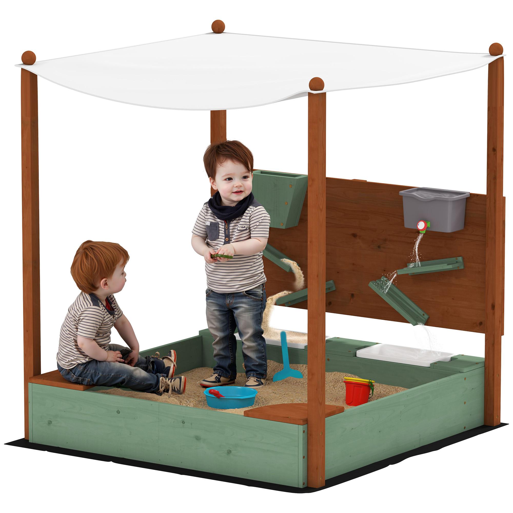Le bac à sable pour enfants AIYAPLAY est équipé d'une paroi arrière pour les jouets de sable et d'eau ainsi que de deux compartiments pour le rangement des jouets et d'un siège pratique. Le bac à sable spacieux vous permet de construire de grands châteaux de sable sous un auvent qui protège des rayons UV. Idéal pour des heures de plaisir en plein air !