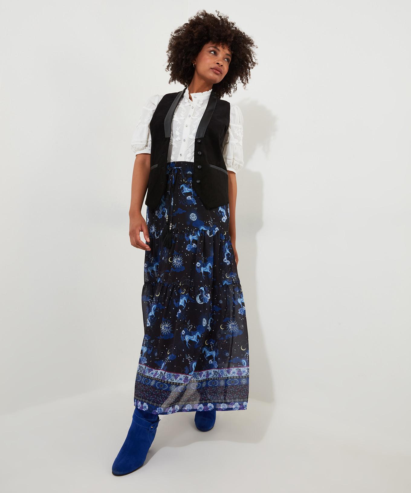 Cette jupe à superpositions imprimée offre un look d'inspiration vintage, parfait pour ajouter une touche de charme bohème à toute garde-robe. Le design présente un motif captivant qui rehausse son esthétique unique.