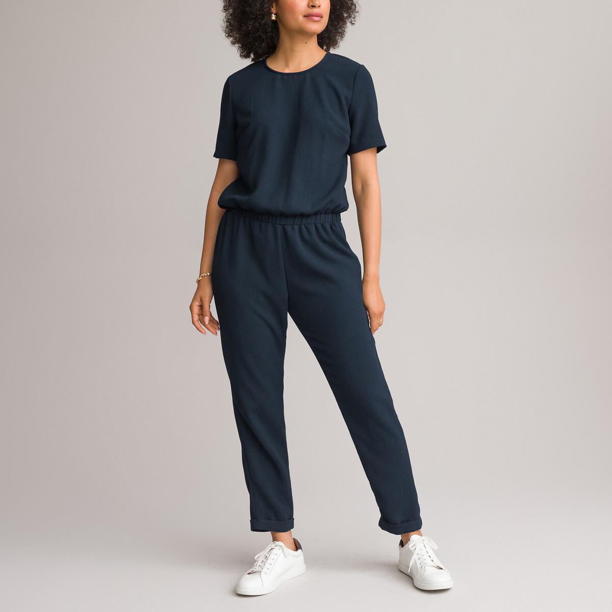 Cette combinaison à manches courtes offre une tenue une pièce confortable et élégante. Le design présente une encolure arrondie et une taille élastiquée pour une silhouette flatteuse. Le pantalon est fuselé avec des ourlets à revers, ajoutant une touche raffinée à l'ensemble.