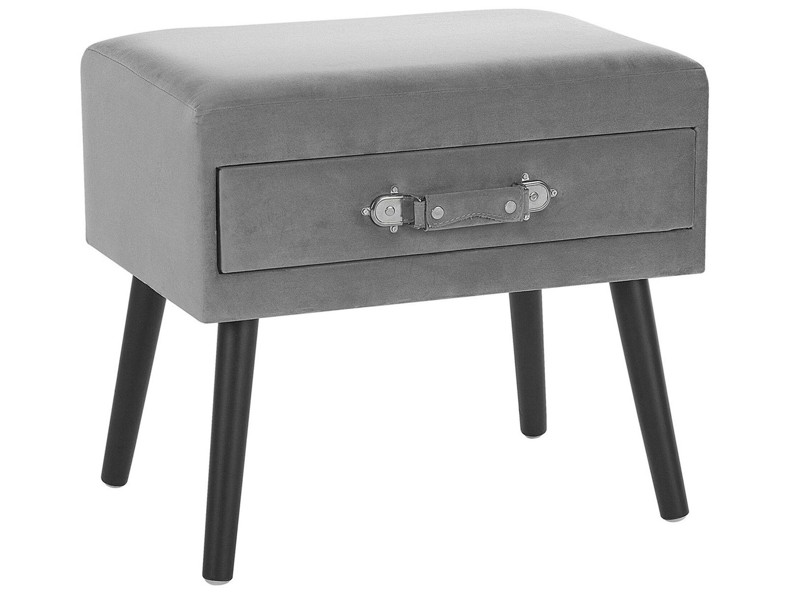 Table de chevet élégante grise avec tiroir. Cette table d'appoint élégante et décorative constitue une pièce complémentaire parfaite dans presque tous les intérieurs, grâce à son design unique, qui combine des influences vintage et modernes. Cette table de chevet est dotée d'un revêtement en velours gris et de pieds noirs minces, complétés par une poignée élégante, qui ressemble à une sangle de valise. Un tiroir pratique offre un espace de rangement supplémentaire pour tous vos petits objets utiles. Cette table de chevet originale peut aussi servir comme tabouret, si jamais les sièges vous manquent lors d'une visite surprise de vos proches.