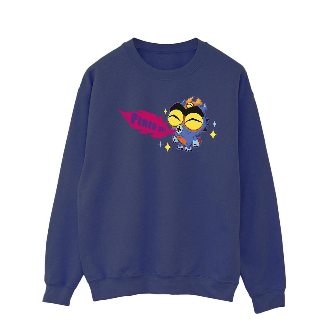 Ce sweatshirt présente un imprimé graphique vibrant, ce qui en fait une pièce remarquable pour les fans. Le design met en scène un personnage de Big Hero 6 avec le texte « Fired Up » dans un style dynamique.