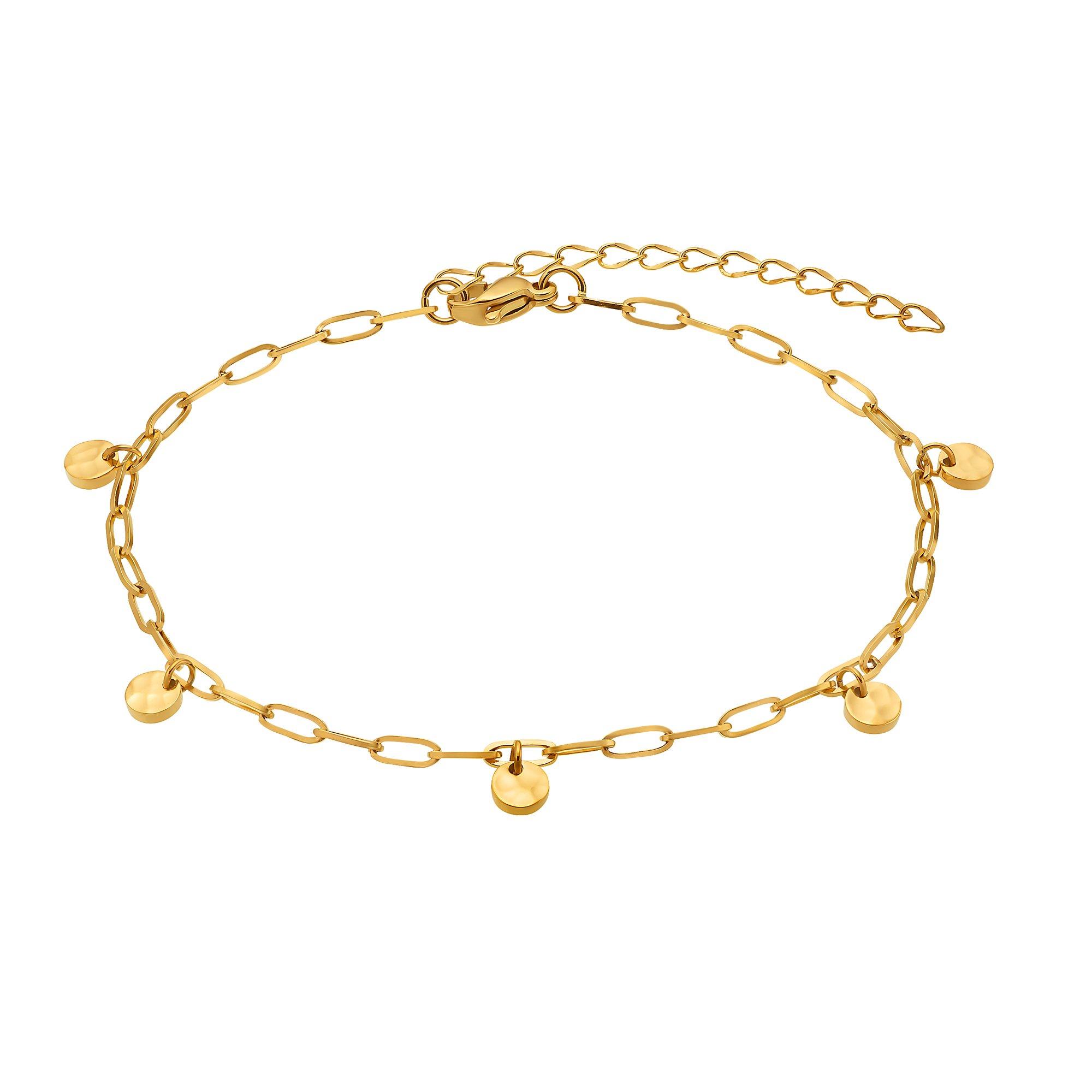 Ce bracelet de cheville dégage un air de bohème moderne et réunit plusieurs tendances : la chaîne d'ancre aérienne se combine particulièrement bien avec les colliers de paperclip branchés, les petites plaques rondes au look martelé allient le caractère artisanal à la géométrie ludique. Ce ravissant bijou s'accorde particulièrement bien avec les robes d'été légères et accompagne à merveille les danses sur la plage et autour du feu de camp.