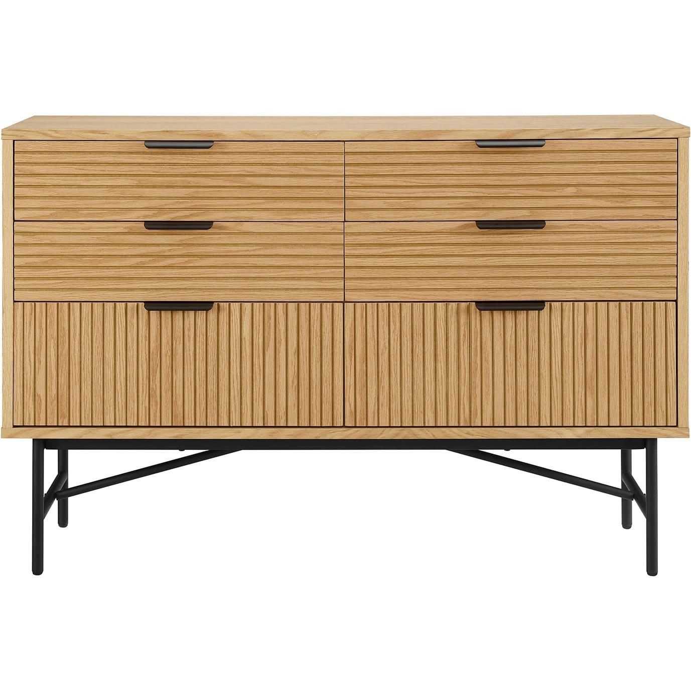 Le placage en chêne clair et les pieds hauts laqués en noir créent non seulement des contrastes modernes, mais apportent également le style scandi en vogue dans votre maison. Le vernis PU résistant aux rayures appliqué sur le corps du meuble le rend particulièrement résistant et durable, ce qui vous permettra de profiter longtemps de votre meuble. Le piètement avec ses pieds filigranes donne un aspect aérien et léger et un caractère loft moderne. L'aspect lambrissé du placage en chêne apporte un petit plus visuel. Dans cette commode, 6 tiroirs offrent un espace de rangement fermé - pour plus d'ordre dans l'espace de vie, en toute simplicité.avec 6 tiroirstiroirs avec fonction Softclose (charnière DTC et glissière)dimensions intérieures des tiroirs : 4x env. L51,5xP33,5xH9,5 cm, 2x env. L51,5xP33,5xH12,5 cmFaçade : MDF (panneau de fibres de densité moyenne), plaqué (essence de bois : chêne)panneau arrière : mélamine couleur chêneStructure : métal revêtu par poudre noircorps avec vernis PU résistant aux rayuresles pieds hauts donnent un caractère loft moderne