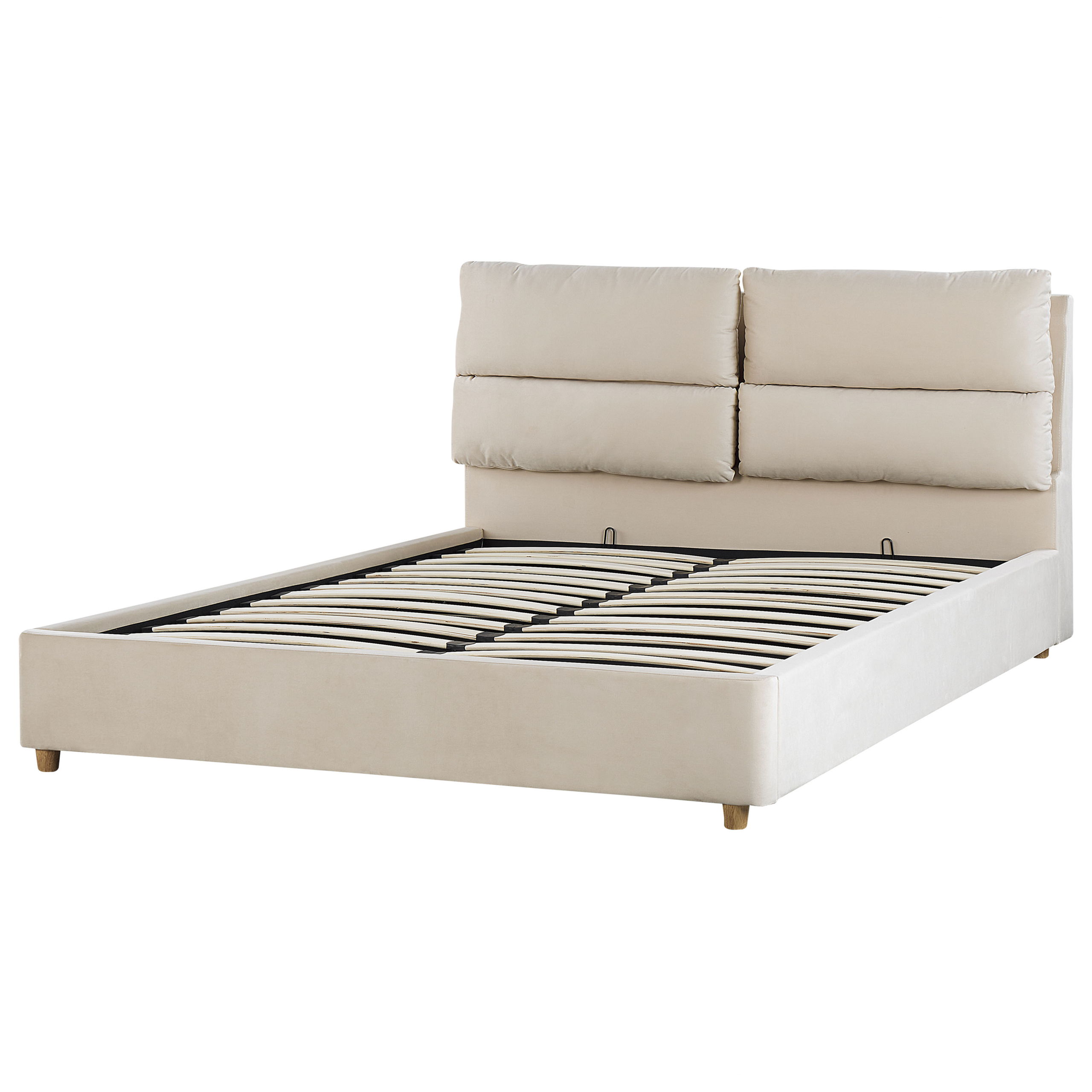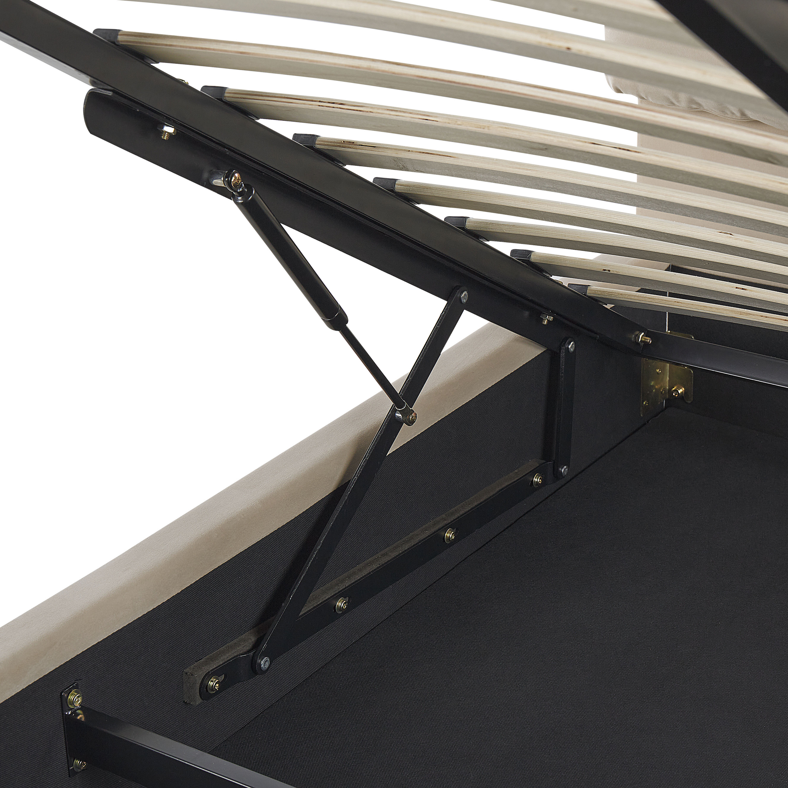 Loffre inclue:</b> 1 x cadre de lit avec rangement, 1 x Sommier (26 lattes articulés), Non inclus : matelas et parure de lit<br> <br><b>Caractéristiques clés:</b> Le sommier à lattes absorbant les chocs offre un soutien parfait, Sommier intégré robuste assurant la durabilité, Style élégant, Tissu soyeux et velouté, Espace de rangement pratique pour toutes vos affaires, Levage pneumatique assurant un accès facile au stockage, Coussins de dossier déhoussables<br> <br><b>Informations dassemblage: À assembler entièrement. 45 - 60 min