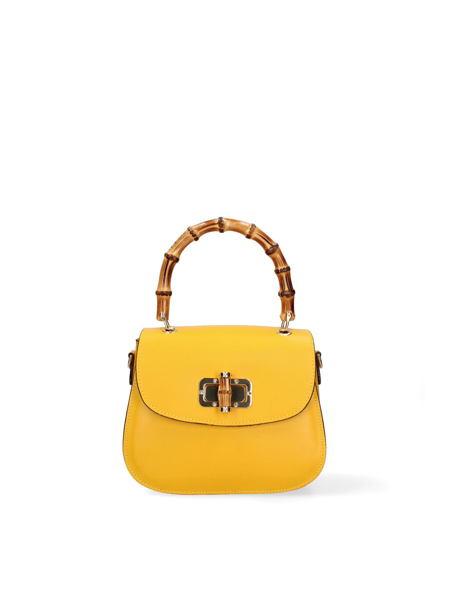 Cet élégant sac à main, fabriqué en Italie, est doté d'une poignée distinctive en bambou, ajoutant une touche de sophistication naturelle à son design. Le sac est sécurisé par un élégant fermoir doré, complétant sa silhouette classique. Fabriqué en cuir véritable, il offre un accessoire intemporel pour diverses occasions.