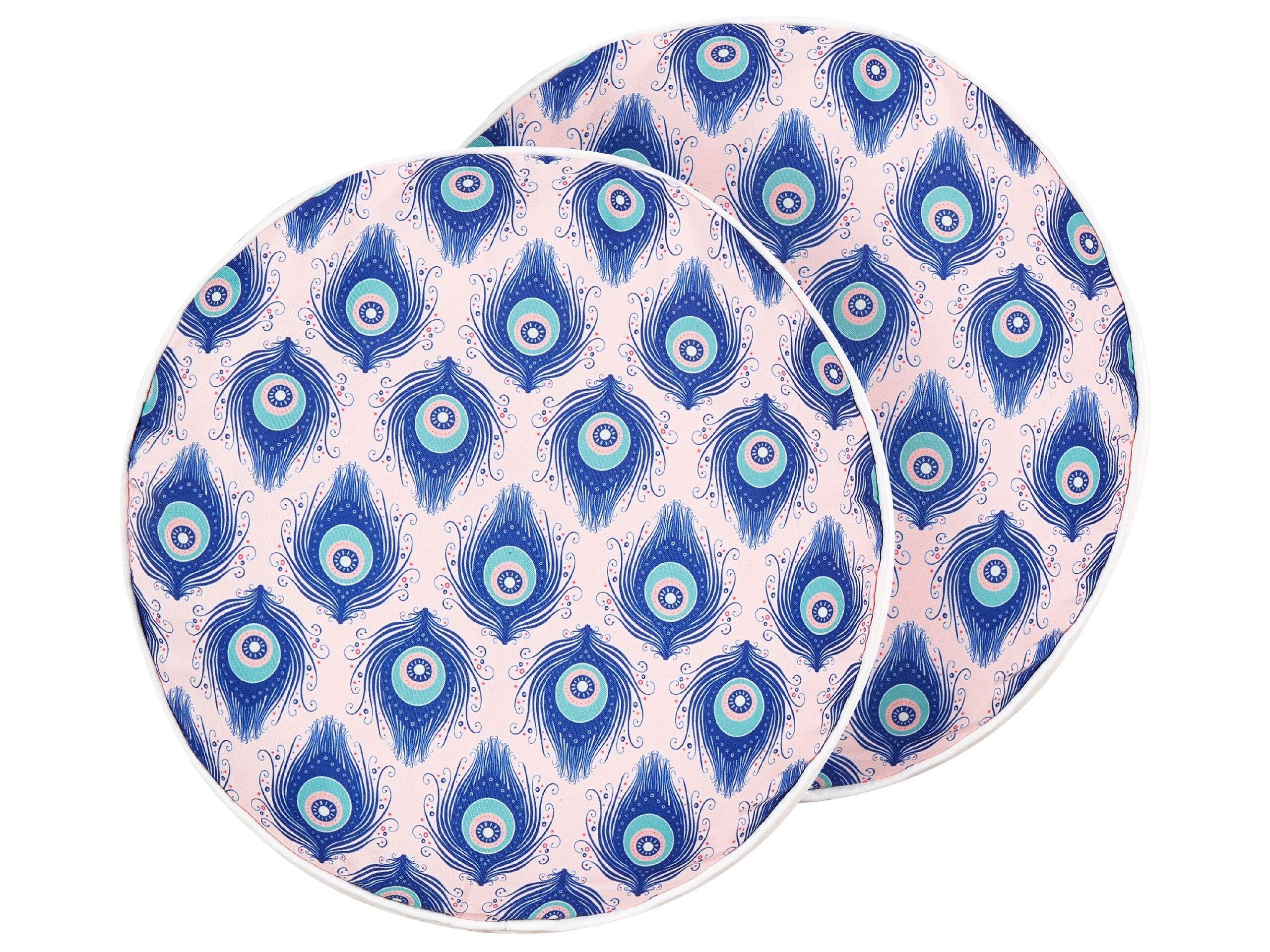 Set de 2 coussins d'extérieur. Cet ensemble de coussins présente un motif vibrant de plumes de paon dans de riches nuances de bleu, apportant une touche de beauté inspirée par la nature à tout espace extérieur. Fabriqué en polyester de haute qualité, facile d'entretien et robuste, chaque coussin comprend une housse amovible pour faciliter le lavage. De plus, les housses sont résistantes à l'eau, ce qui les rend idéales pour les jardins ou les balcons. La texture classique du motif complexe fait de ces coussins un accent parfait pour les décors modernes et traditionnels.