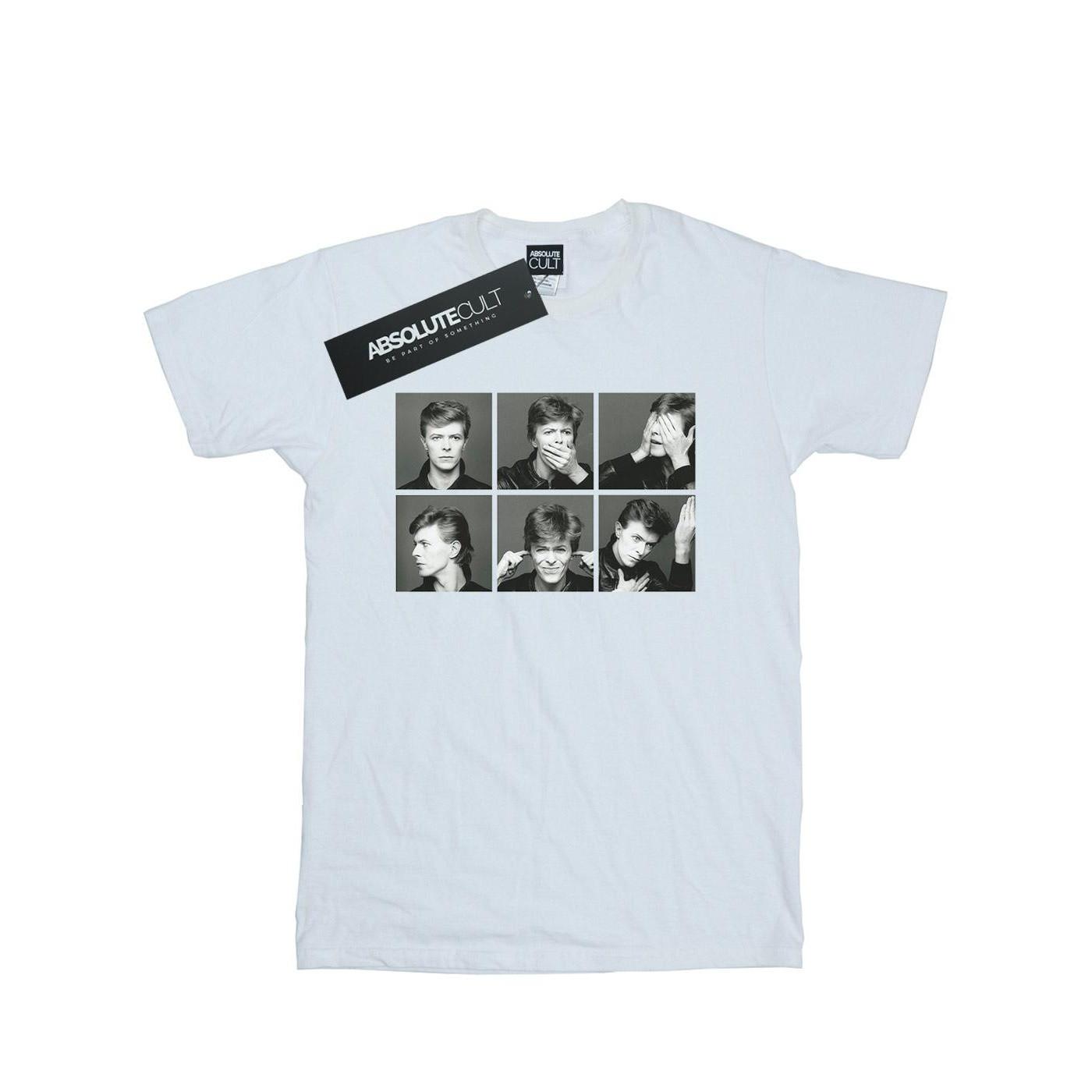 Ce T-shirt présente un col ras-du-cou classique et des manches courtes, offrant une coupe confortable et polyvalente. Le devant du T-shirt affiche une grille de six images en noir et blanc de David Bowie, capturant diverses expressions et poses. Ce design en fait une pièce distinctive pour les fans de l'artiste emblématique.