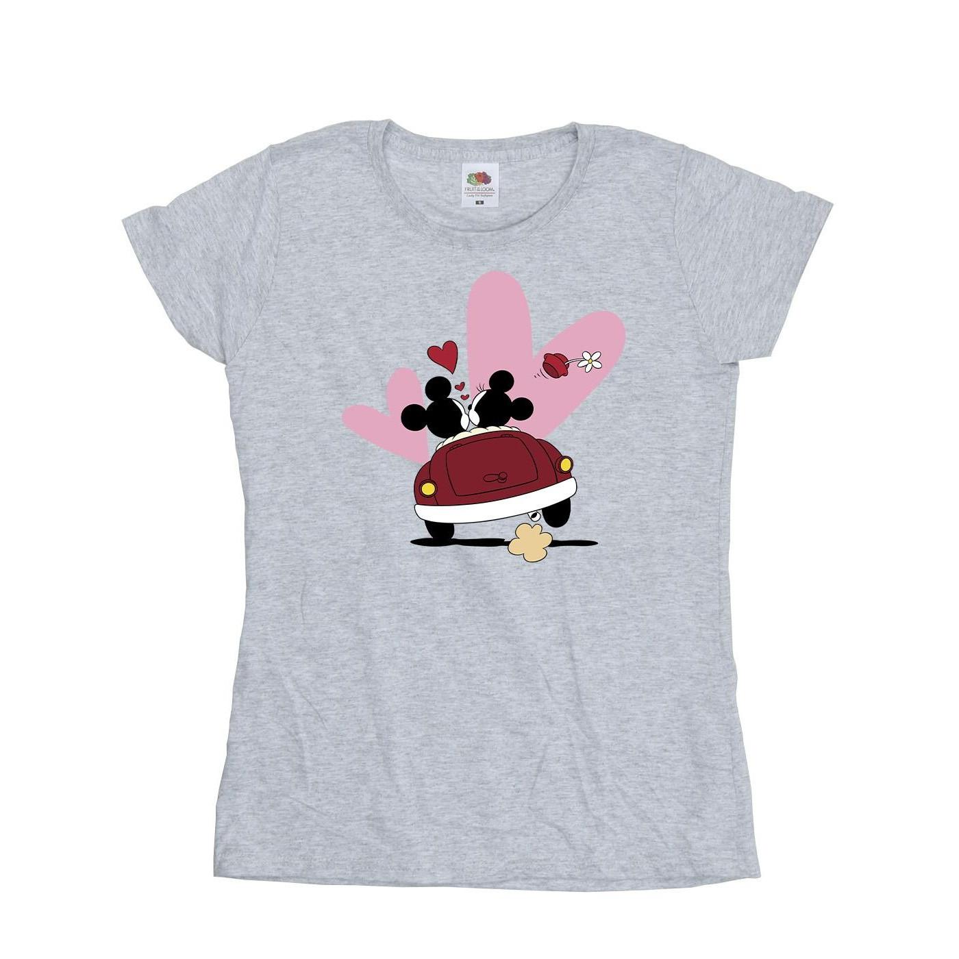 Ce T-shirt présente un charmant imprimé de Mickey et Minnie Mouse dans une voiture, entourés de cœurs, ce qui en fait un ajout ravissant à toute garde-robe décontractée. Le col rond classique et les manches courtes offrent une coupe confortable et polyvalente.