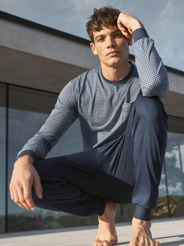 Cet ensemble de pyjama de Calida offre un design classique et masculin, parfait pour la nuit et la maison. La chemise à manches longues est dotée d'un col en V et d'une poche poitrine plaquée, tandis que le pantalon long est équipé d'une ceinture confort recouverte de tissu pour une sensation agréable.