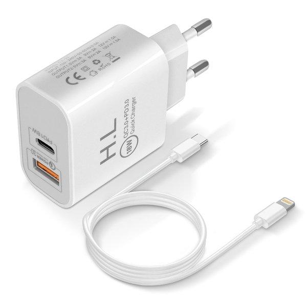 Chargeur secteur avec 2 ports USB et USB-C, pour une recharge simultanés de 2 appareils. Charge rapide 18W / 3A. Technologies Power Delivery et Quick Charge 3.0. Câble de charge et synchronisation USB-C vers Lightning 1,5 m inclus.