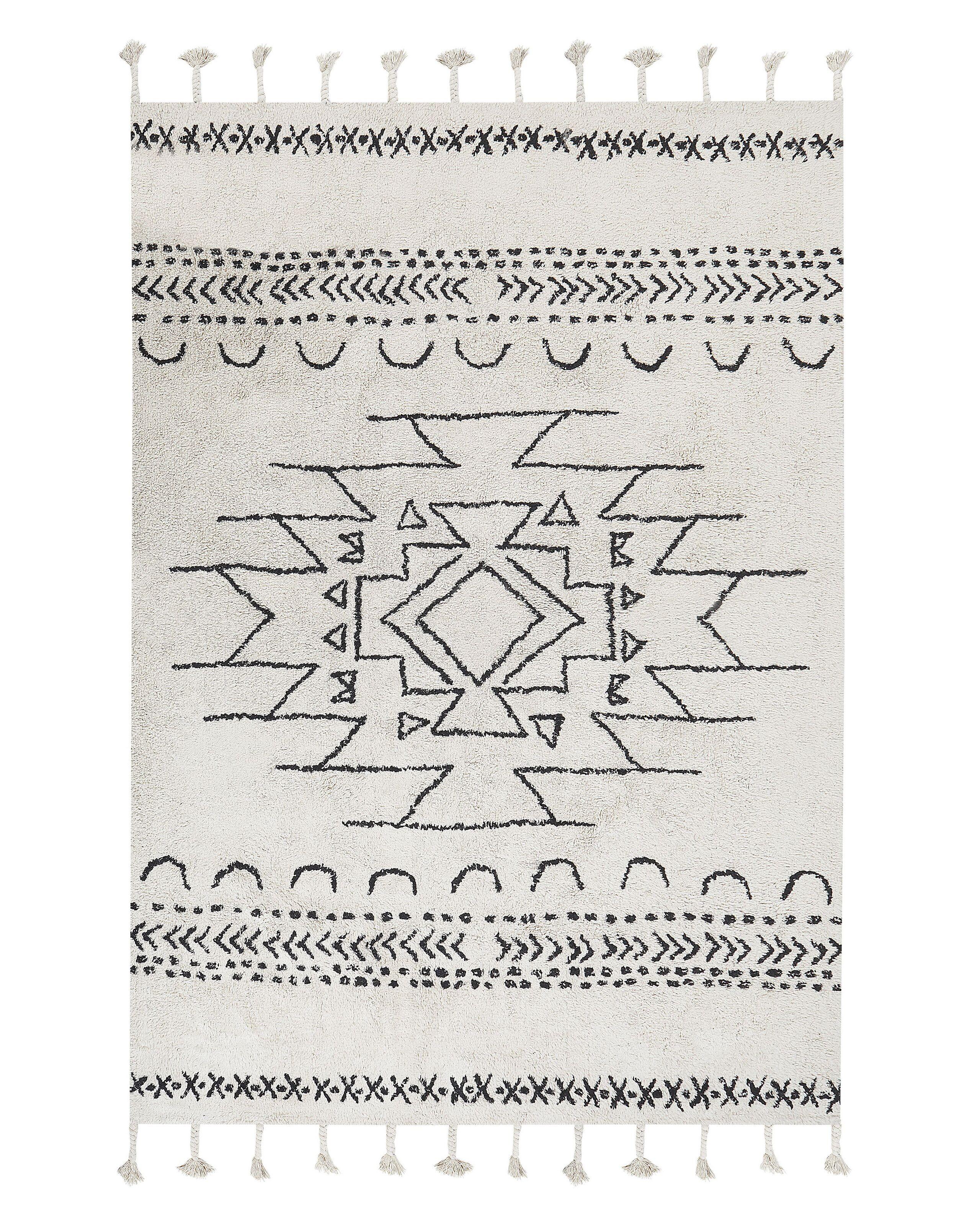 Tapis à franges. Placez ce tapis à côté de votre lit ou de votre canapé, afin de profiter de sa douceur à chaque fois que vous posez le pied sur le sol. Ce tapis est doux et robuste, car il a été tufté à la main avec la plus grande précision à partir d'un coton de haute qualité. Les pompons intégrés et le motif géométrique ajoutent une touche orientale qui s'harmonisera parfaitement avec les intérieurs modernes.