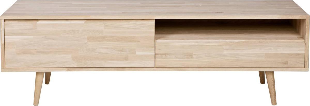 Matériau : Chêne non traité Design : style rétro des années 60 Fonctionnalité : 1 tiroir et 1 compartiment ouvert pour les appareils multimédia, les DVD et les CD. Passage des câbles : trou dans la plaque de fond derrière le tiroir pour un câblage ordonné