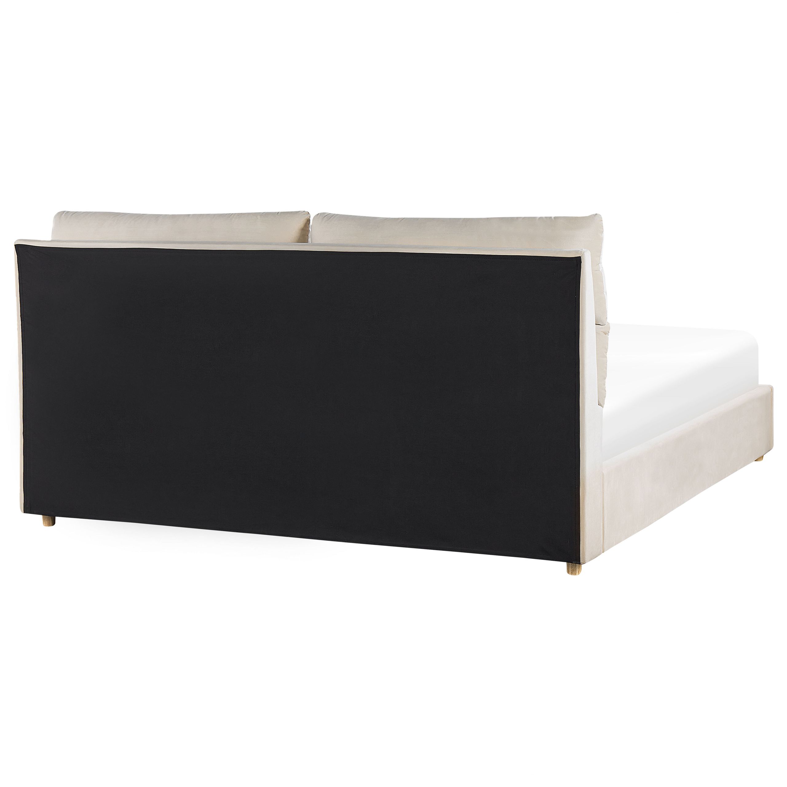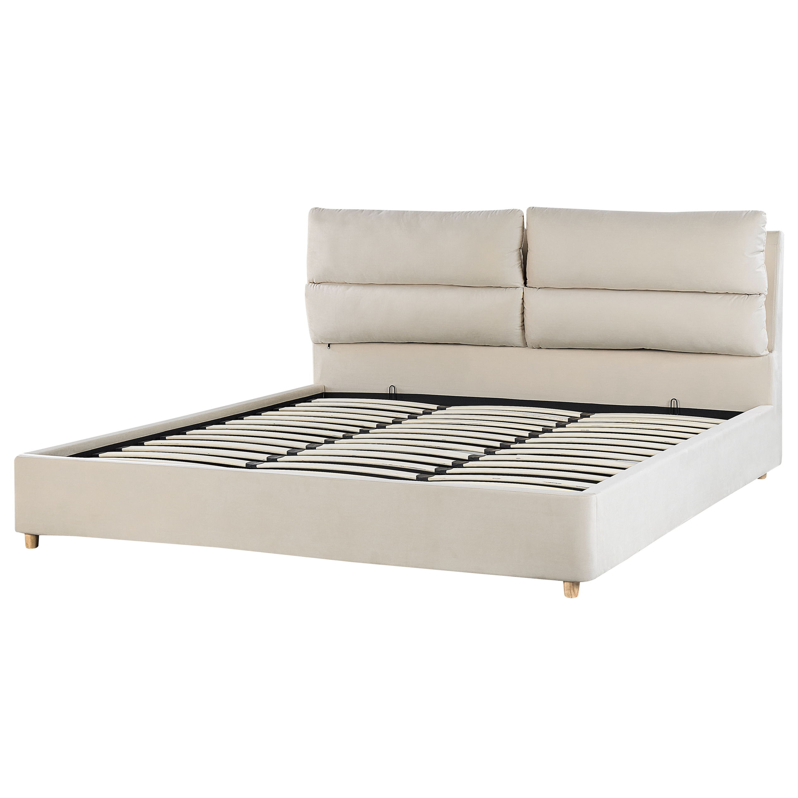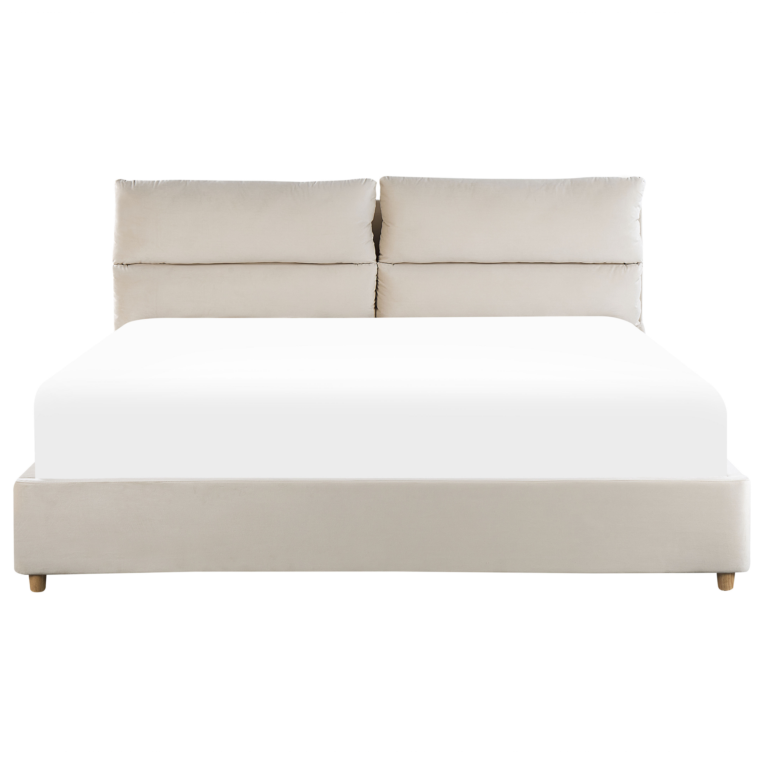 Lit avec rangement. Ce lit élégant, au design contemporain, est doté d'un appui-tête haut et d'un grand espace de rangement. Sa forme rectangulaire lui confère une apparence très traditionnelle, mais combinée à l'épais appui-tête en forme de coussin, l'ensemble gagne en modernité. Les pieds minces mais solides et durables ne détournent pas l'attention du design chic, mais assurent une construction robuste. Le lit est fini en velours beige clair, ce qui rehausse son aspect sophistiqué et accrocheur.