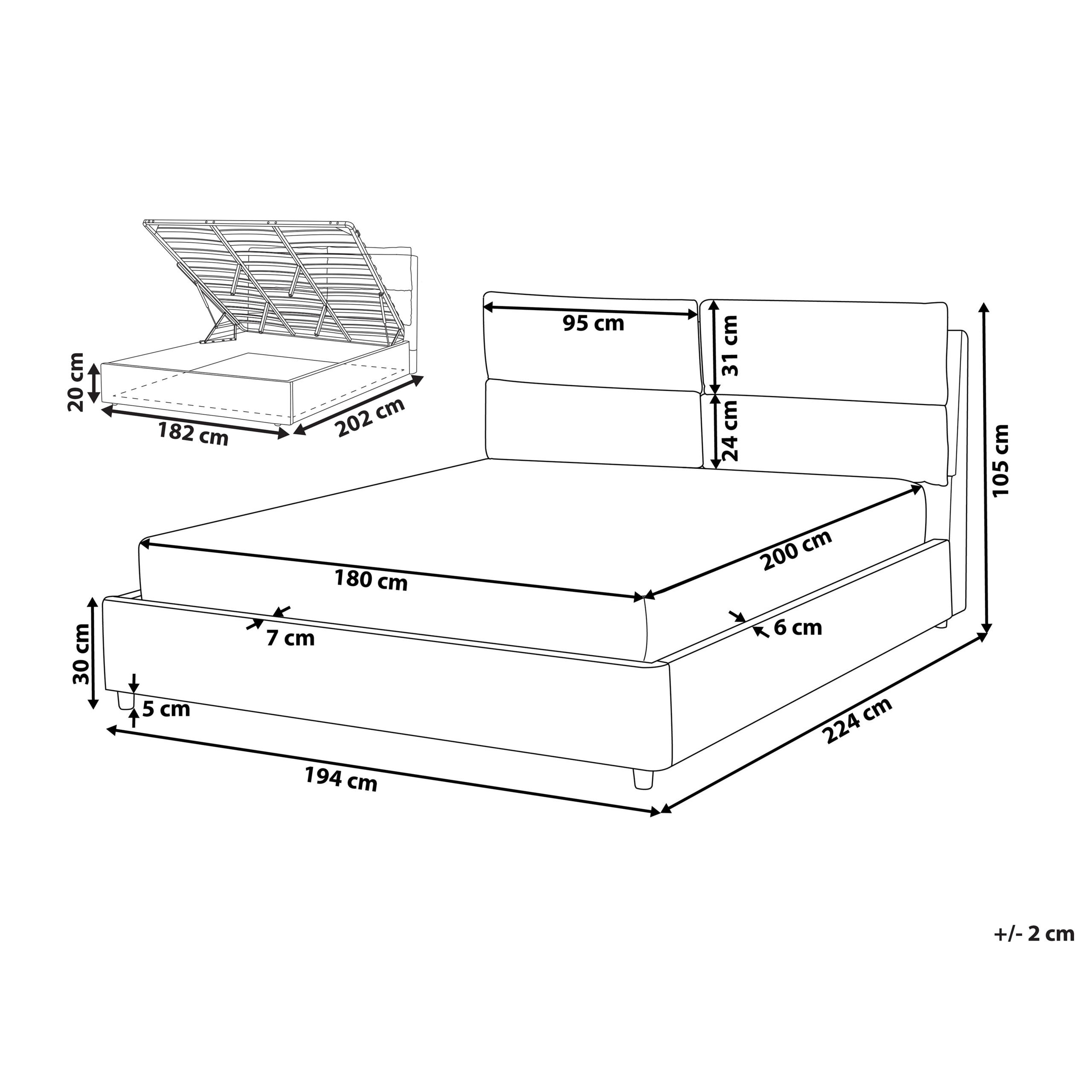 Loffre inclue:</b> 1 x cadre de lit avec rangement, 1 x Sommier (39 lattes articulées), Non inclus : matelas et parure de lit<br> <br><b>Caractéristiques clés:</b> Le sommier à lattes absorbant les chocs offre un soutien parfait, Sommier intégré robuste assurant la durabilité, Style élégant, Tissu soyeux et velouté, Espace de rangement pratique pour toutes vos affaires, Levage pneumatique assurant un accès facile au stockage, Coussins de dossier déhoussables<br> <br><b>Informations dassemblage: À assembler entièrement. 45 - 60 min