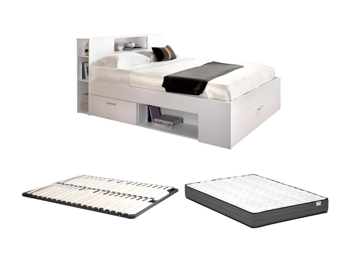 Vente-unique Lit avec tête de lit rangements et tiroirs - 160 x 200 cm - Coloris : Blanc + Sommier + Matelas - LEANDRE